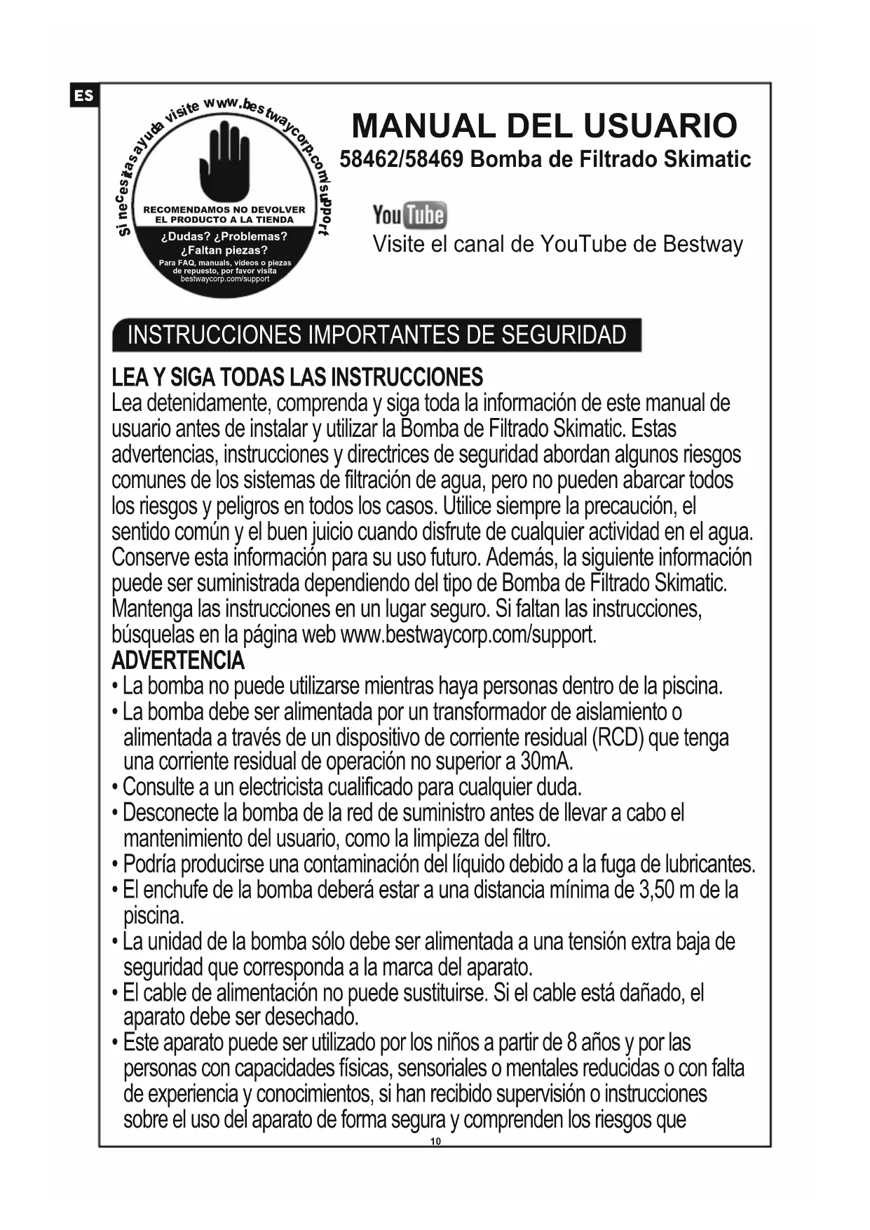 - Jos ohjeet puuttuvat tai katoavat, ota yhteyttä Bestwayhin tai hae ne verkkosivustolta osoitteessa www.bestwaycorp.com• No añada productos químicos en la bomba de filtrado.