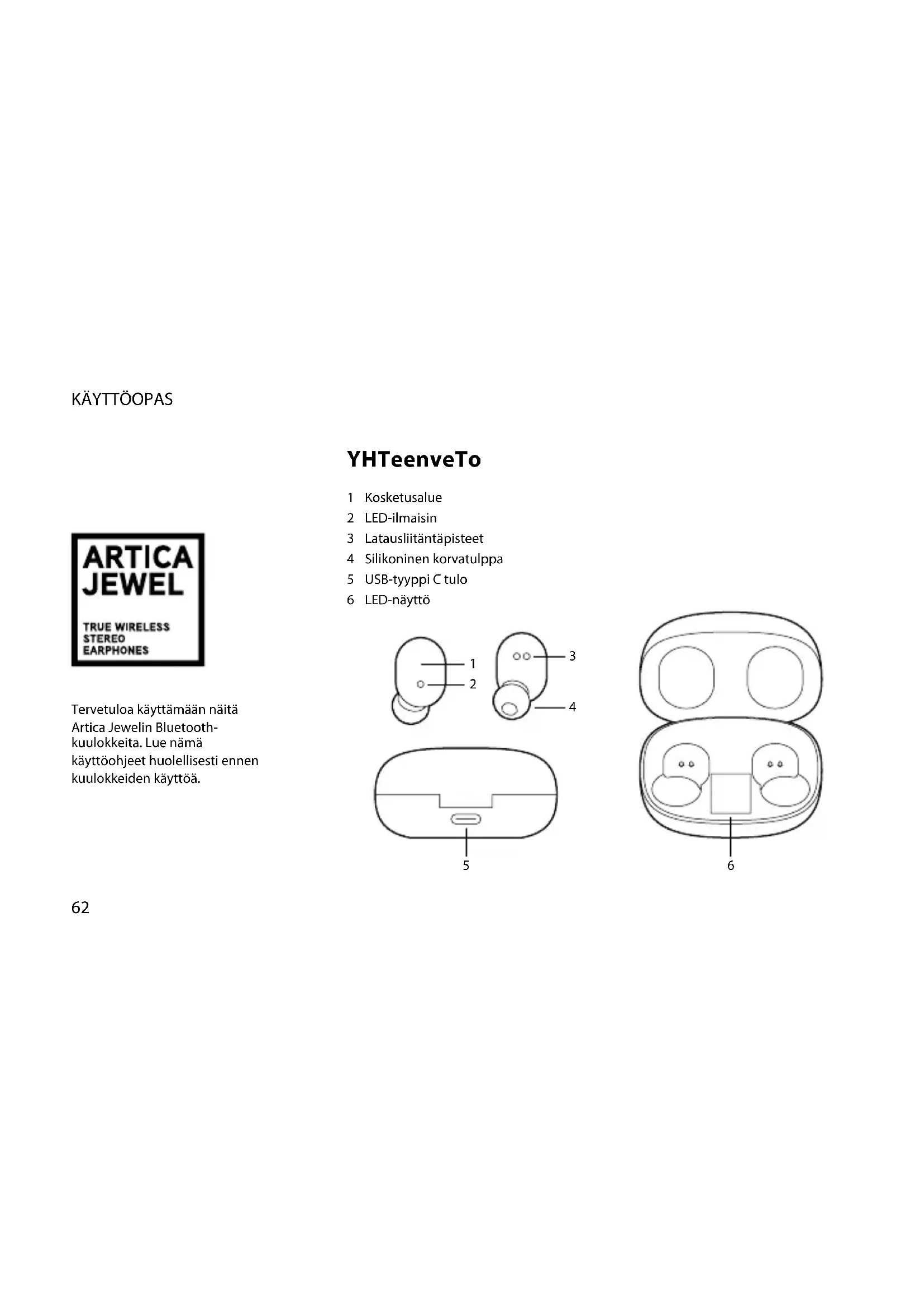 Tervetuloa käyttämään näitä Artica Jewelin Bluetooth- kuulokkeita. Lue nämä käyttöohjeet huolellisesti ennen kuulokkeiden käyttöä. YHTeenveTo Kosketusalue LED-ilmaisin Latausliitäntäpisteet Silikoninen korvatulppa USB-tyyppi C tulo LED-näyttö