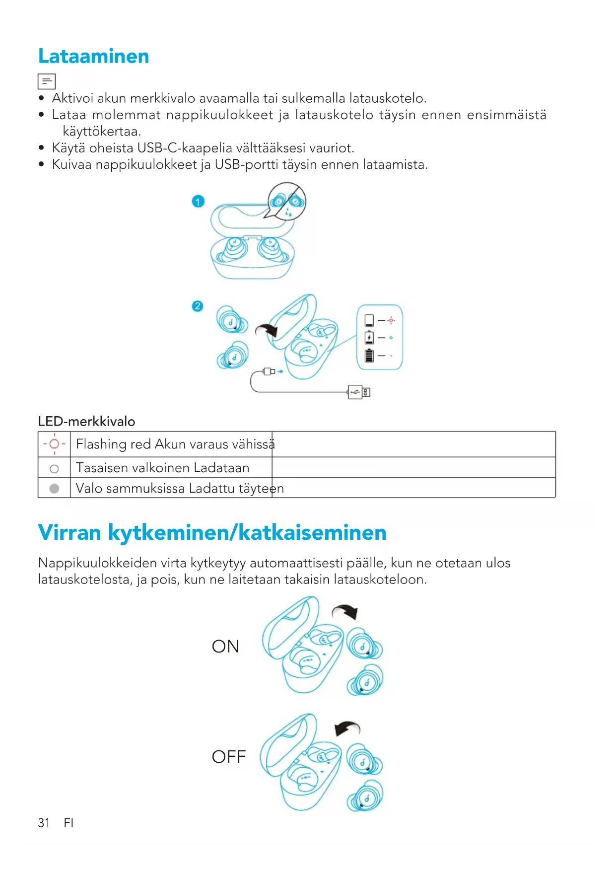 - Lataa molemmat nappikuulokkeet ja latauskotelo täysin ennen ensimmäistä käyttökertaa.