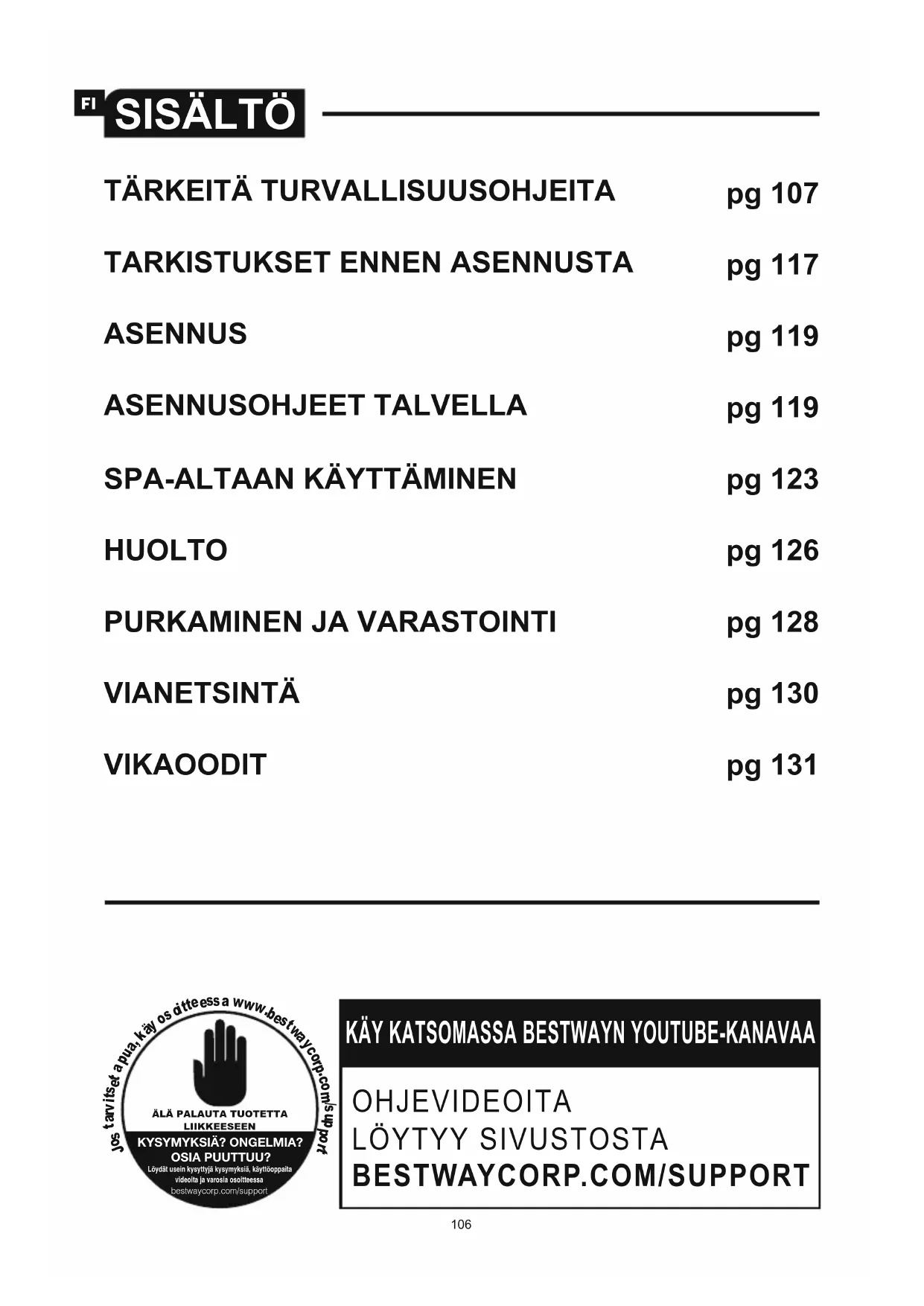 Für weitere Hilfe besuchen Sie bitte den Bereich “Unterstützung” auf unserer Webseite, www.bestwaycorp.de FEHLERCODES 105SISÄLTÖ TURVAOHJEET Lue huolellisesti kaikki tämän käyttöoppaan ohjeet ja ymmärrä ja noudata niitä ennen spa-altaan asentamista ja käyttämistä.