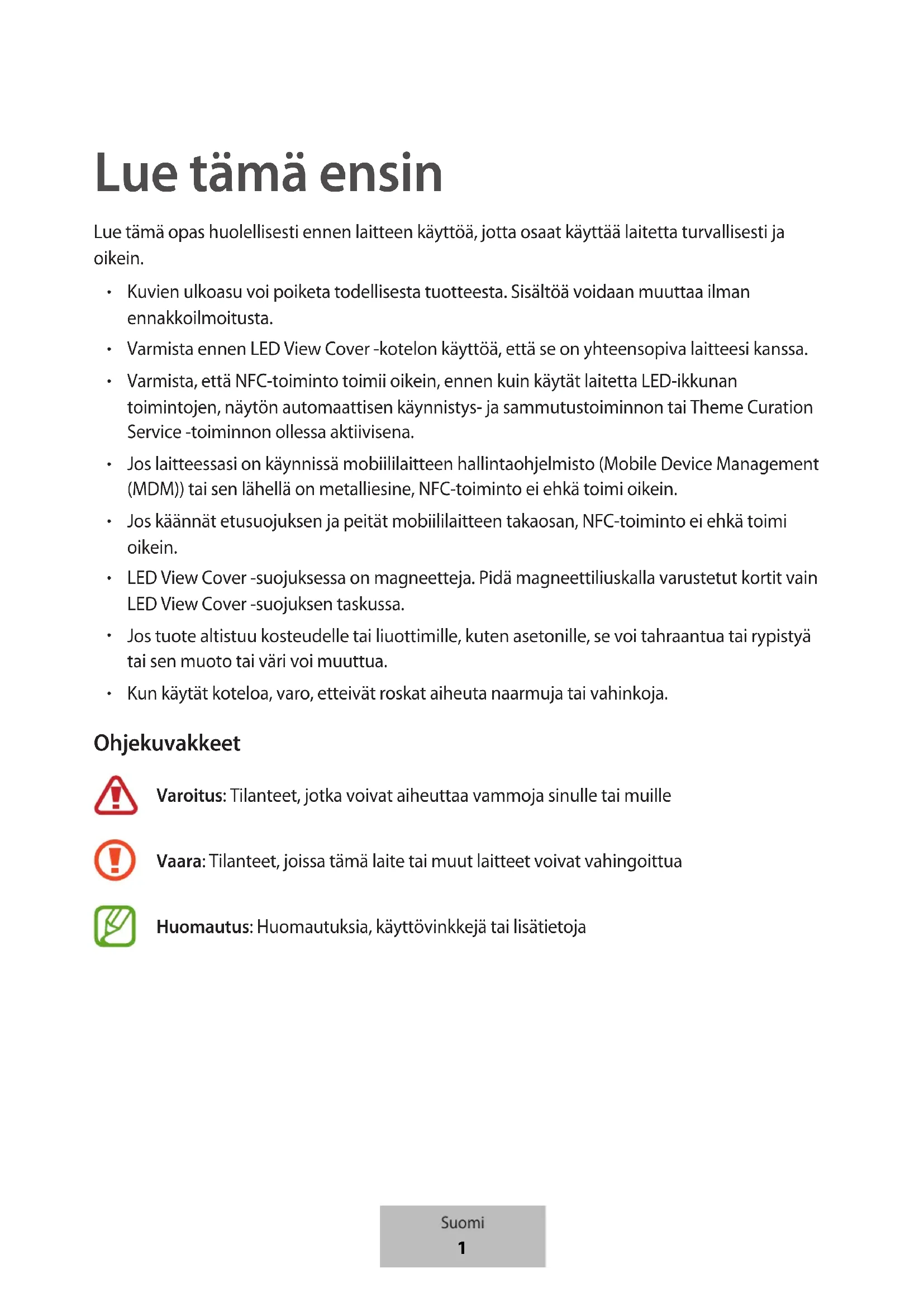Kun käytät koteloa, varo, etteivät roskat aiheuta naarmuja tai vahinkoja. Ohjekuvakkeet Varoitus: Tilanteet, jotka voivat aiheuttaa vammoja sinulle tai muille Vaara: Tilanteet, joissa tämä laite tai muut laitteet voivat vahingoittua Huomautus: Huomautuksia, käyttövinkkejä tai lisätietoja Suomi