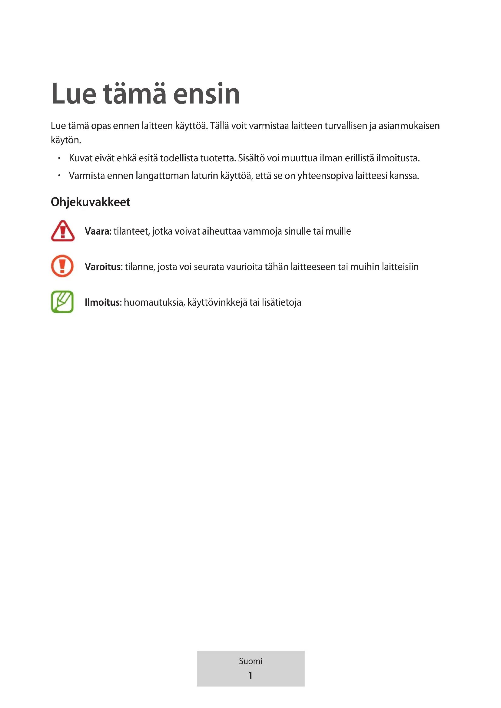 Alle andre varemerker og opphavsrettigheter tilhører sine respektive eiere.1 Suomi Lue tämä ensin Lue tämä opas ennen laitteen käyttöä. Tällä voit varmistaa laitteen turvallisen ja asianmukaisen käytön.