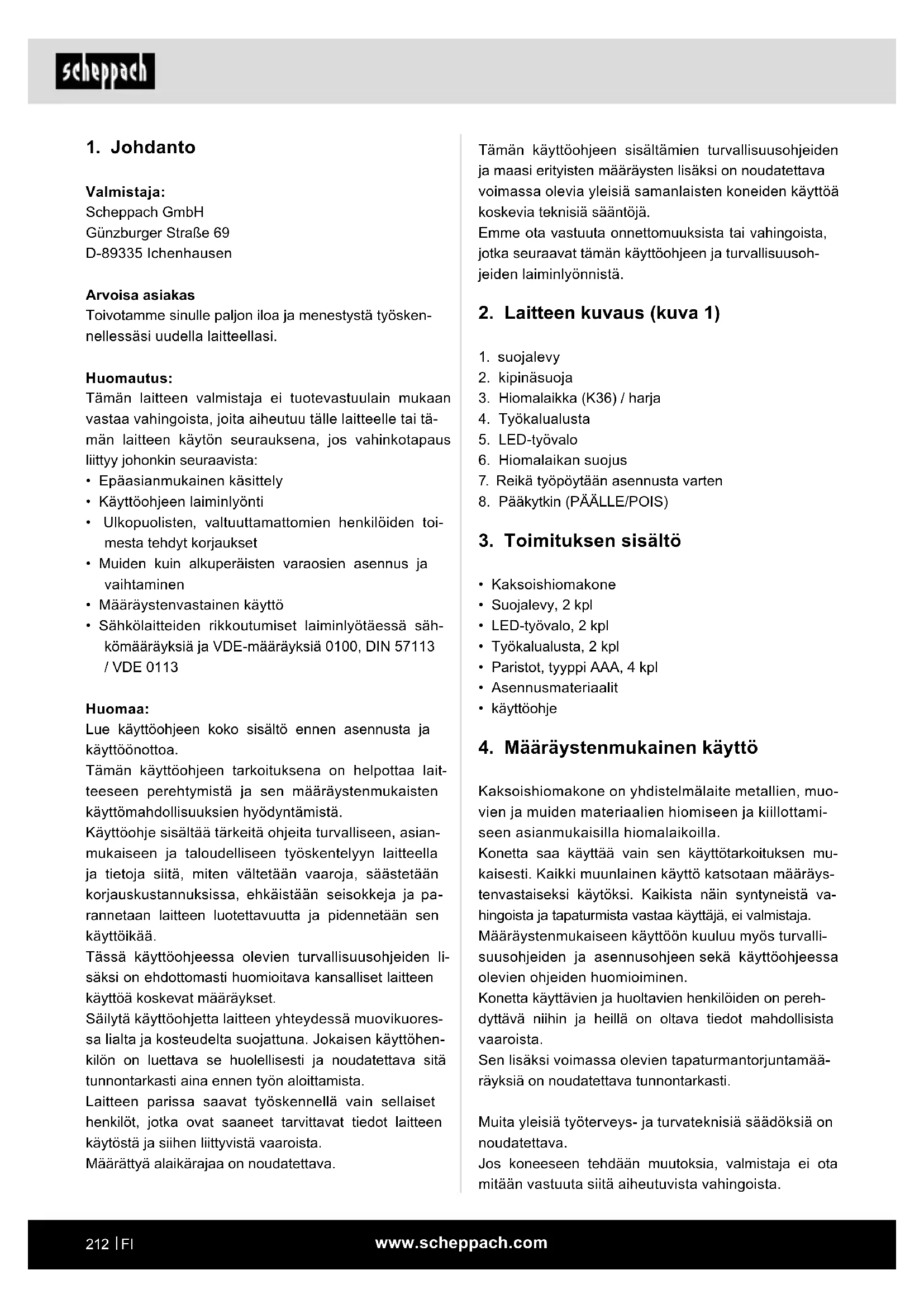 - Älä koskaan käytä laitetta muuhun kuin sille määri- tettyyn käyttötarkoitukseen.www.scheppach.com