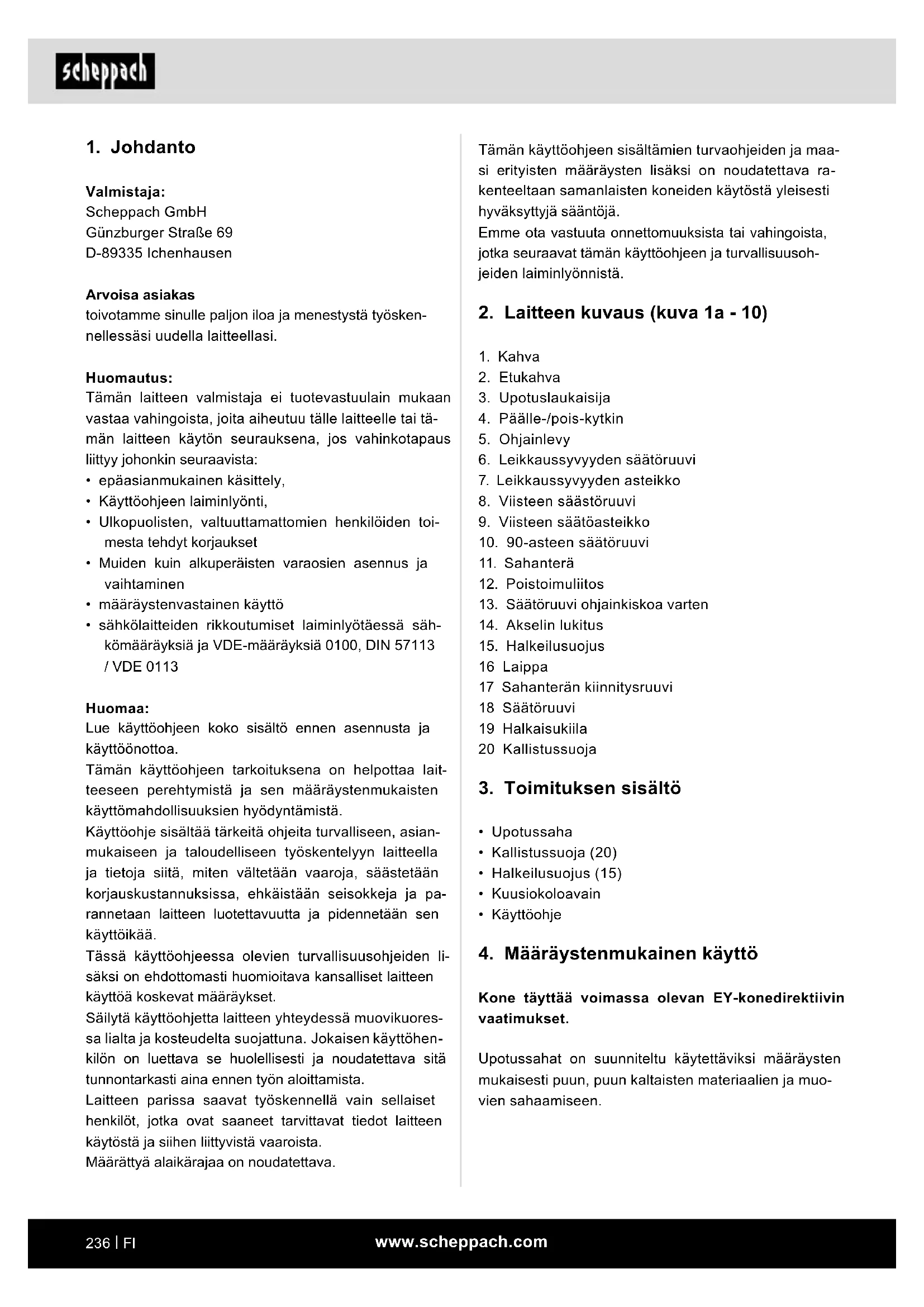 Valmistaja: Scheppach GmbH Günzburger Straße 69 D-89335 Ichenhausen Arvoisa asiakas toivotamme sinulle paljon iloa ja menestystä työsken- nellessäsi uudella laitteellasi. Huomautus: Tämän laitteen valmistaja ei tuotevastuulain mukaan vastaa vahingoista, joita aiheutuu tälle laitteelle tai tä- män laitteen käytön seurauksena, jos vahinkotapaus liittyy johonkin seuraavista: