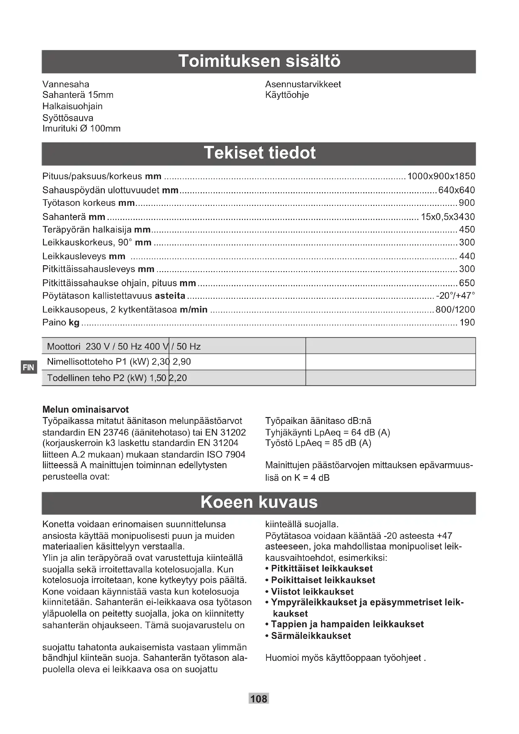 107Toimituksen sisältö Vannesaha Sahanterä 15mm Halkaisuohjain Syöttösauva Imurituki Ø 100mm Asennustarvikkeet Käyttöohje Tekiset tiedot Pituus/paksuus/korkeus mm ..............................................................................................1000x900x1850 Sahauspöydän ulottuvuudet mm ....................................................................................................640x640 Työtason korkeus mm ............................................................................................................................. 900 Sahanterä mm ......................................................................................................................... 15x0,5x3430 Teräpyörän halkaisija mm ....................................................................................................................... 450 Leikkauskorkeus, 90° mm ......................................................................................................................300 Leikkausleveys mm ............................................................................................................................... 440 Pitkittäissahausleveys mm ..................................................................................................................... 300 Pitkittäissahaukse ohjain, pituus mm ..................................................................................................... 650 Pöytätason kallistettavuus asteita ................................................................................................ -20°/+47° Leikkausopeus, 2 kytkentätasoa m/min ....................................................................................... 800/1200 Paino kg .................................................................................................................................................. 190 Melun ominaisarvot Työpaikassa mitatut äänitason melunpäästöarvot standardin EN 23746 (äänitehotaso) tai EN 31202 (korjauskerroin k3 laskettu standardin EN 31204 liitteen A.2 mukaan) mukaan standardin ISO 7904 liitteessä A mainittujen toiminnan edellytysten perusteella ovat: Työpaikan äänitaso dB:nä Tyhjäkäynti LpAeq = 64 dB (A) Työstö LpAeq = 85 dB (A) Mainittujen päästöarvojen mittauksen epävarmuus- lisä on K = 4 dB Koeen kuvaus Konetta voidaan erinomaisen suunnittelunsa ansiosta käyttää monipuolisesti puun ja muiden materiaalien käsittelyyn verstaalla. Ylin ja alin teräpyöraä ovat varustettuja kiinteällä suojalla sekä irroitettavalla kotelosuojalla. Kun kotelosuoja irroitetaan, kone kytkeytyy pois päältä. Kone voidaan käynnistää vasta kun kotelosuoja kiinnitetään. Sahanterän ei-Ieikkaava osa työtason yläpuolella on peitetty suojalla, joka on kiinnitetty sahanterän ohjaukseen. Tämä suojavarustelu on suojattu tahatonta aukaisemista vastaan ylimmän bändhjul kiinteän suoja. Sahanterän työtason ala- puolella oleva ei leikkaava osa on suojattu kiinteällä suojalla. Pöytätasoa voidaan kääntää -20 asteesta +47 asteeseen, joka mahdollistaa monipuoliset leik- kausvaihtoehdot, esimerkiksi: