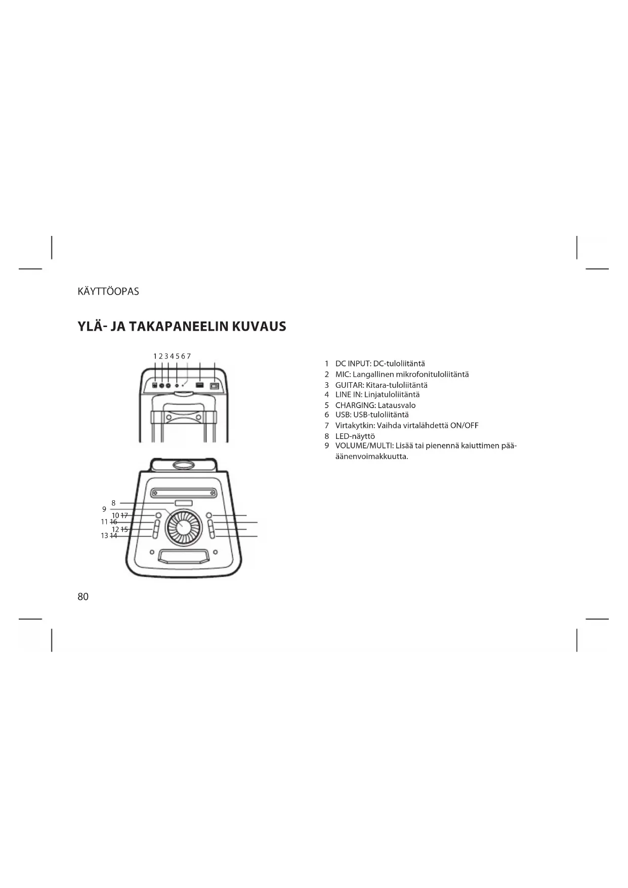 DC INPUT: DC-tuloliitäntä MIC: Langallinen mikrofonituloliitäntä GUITAR: Kitara-tuloliitäntä LINE IN: Linjatuloliitäntä CHARGING: Latausvalo USB: USB-tuloliitäntä Virtakytkin: Vaihda virtalähdettä ON/OFF LED-näyttö VOLUME/MULTI: Lisää tai pienennä kaiuttimen pää- äänenvoimakkuutta.