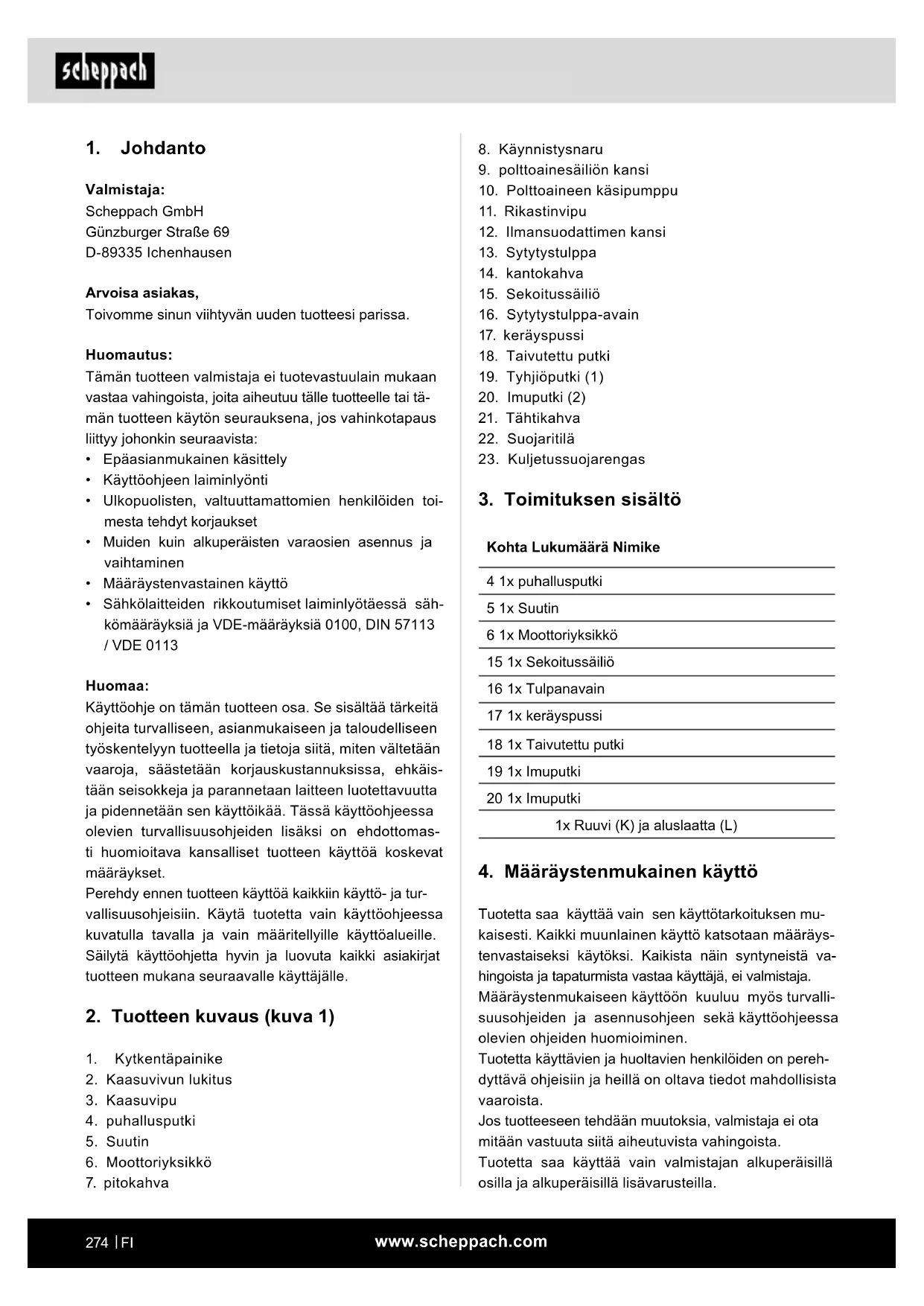 Valmistaja: Scheppach GmbH Günzburger Straße 69 D-89335 Ichenhausen Arvoisa asiakas, Toivomme sinun viihtyvän uuden tuotteesi parissa. Huomautus: Tämän tuotteen valmistaja ei tuotevastuulain mukaan vastaa vahingoista, joita aiheutuu tälle tuotteelle tai tä- män tuotteen käytön seurauksena, jos vahinkotapaus liittyy johonkin seuraavista: