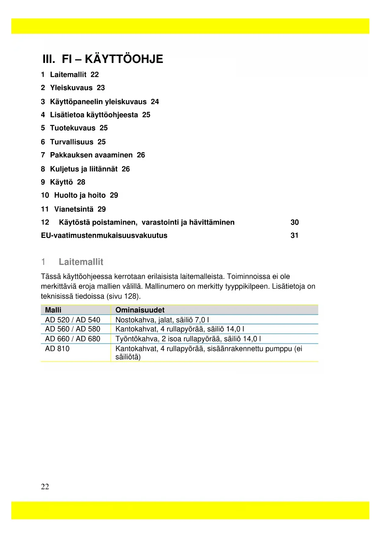 1 Laitemallit 22 2 Yleiskuvaus 23 3 Käyttöpaneelin yleiskuvaus 24 4 Lisätietoa käyttöohjeesta 25 5 Tuotekuvaus 25 6 Turvallisuus 25 7 Pakkauksen avaaminen 26 8 Kuljetus ja liitännät 26 9 Käyttö 28 10 Huolto ja hoito 29 11 Vianetsintä 29 12 Käytöstä poistaminen, varastointi ja hävittäminen 30 EU-vaatimustenmukaisuusvakuutus 31 1 Laitemallit Tässä käyttöohjeessa kerrotaan erilaisista laitemalleista. Toiminnoissa ei ole merkittäviä eroja mallien välillä. Mallinumero on merkitty tyyppikilpeen. Lisätietoja on teknisissä tiedoissa (sivu 128). Malli Ominaisuudet AD 520 / AD 540 Nostokahva, jalat, säiliö 7,0 l AD 560 / AD 580 Kantokahvat, 4 rullapyörää, säiliö 14,0 l AD 660 / AD 680 Työntökahva, 2 isoa rullapyörää, säiliö 14,0 l AD 810 Kantokahvat, 4 rullapyörää, sisäänrakennettu pumppu (ei säiliötä)23 2 Yleiskuvaus