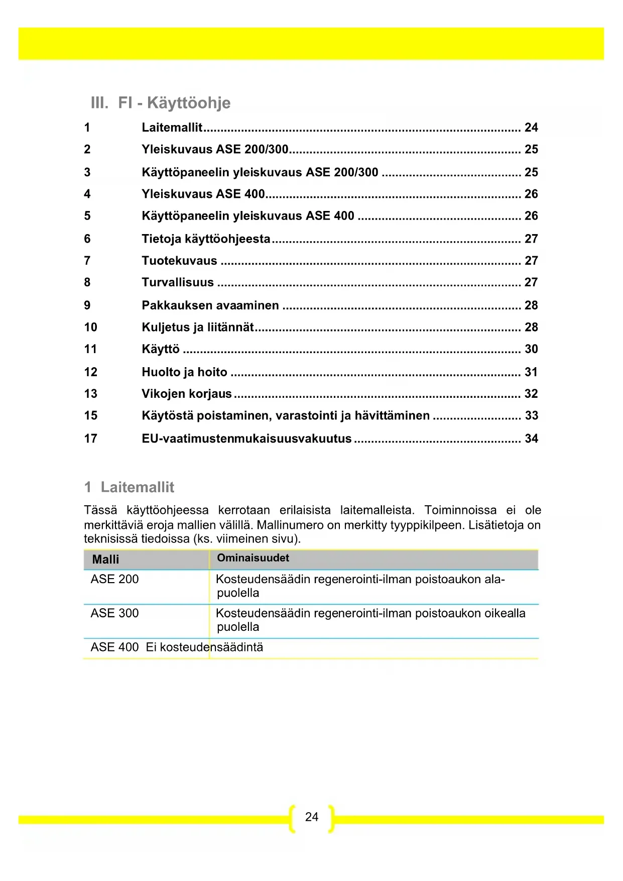 - 17 EU-vaatimustenmukaisuusvakuutus 1 Laitemallit Tässä käyttöohjeessa kerrotaan erilaisista laitemalleista. Toiminnoissa ei ole merkittäviä eroja mallien välillä. Mallinumero on merkitty tyyppikilpeen. Lisätietoja on teknisissä tiedoissa (ks. viimeinen sivu). Malli Ominaisuudet ASE 200 Kosteudensäädin regenerointi-ilman poistoaukon ala- puolella ASE 300 Kosteudensäädin regenerointi-ilman poistoaukon oikealla puolella ASE 400 Ei kosteudensäädintä25 p. 34