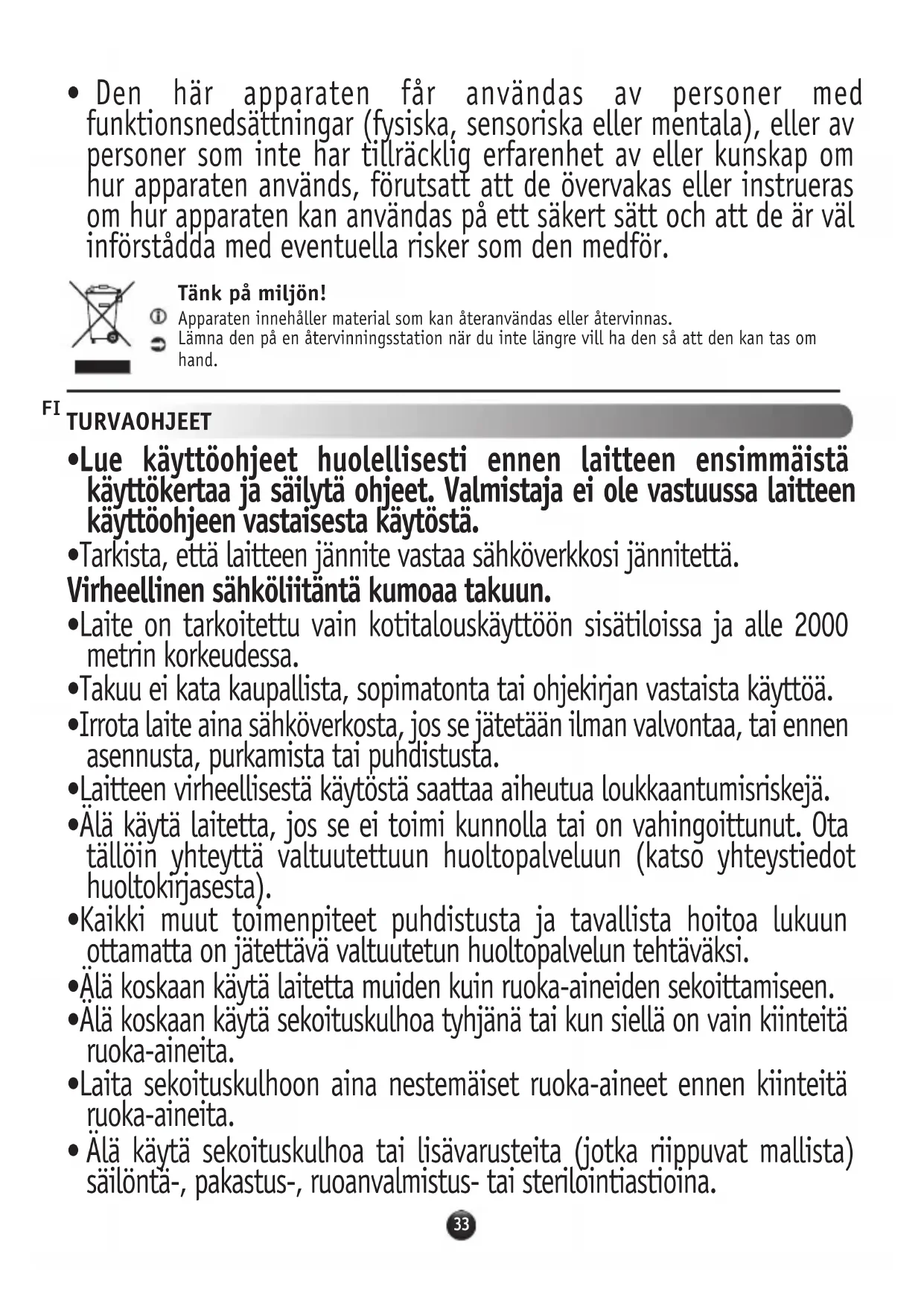 - Tätä laitetta ei ole tarkoitettu sellaisten henkilöiden (mukaan lukien lapset) käytettäväksi, joiden fyysiset, aisteihin liittyvät tai henkiset kyvyt ovat rajalliset tai joilla ei ole riittävästi tietoa ja kokemusta, jos he eivät saa apua heidän turvallisuudestaan huolehtivilta henkilöiltä, jotka valvovat ja antavat heille laitteen käyttöä koskevia ohjeita.
