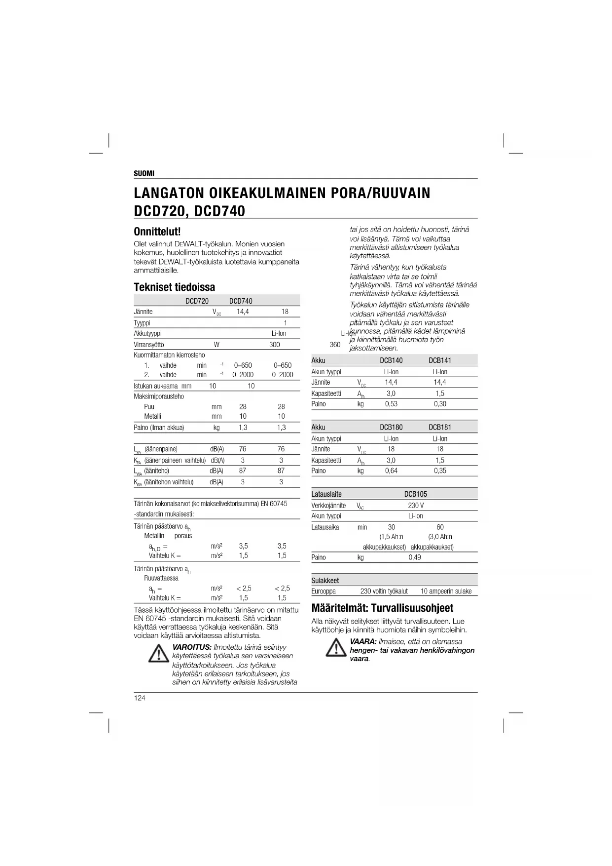 DCD720, DCD740 Onnittelut! Olet valinnut DEWALT-työkalun. Monien vuosien kokemus, huolellinen tuotekehitys ja innovaatiot tekevät D EWALT-työkaluista luotettavia kumppaneita ammattilaisille. Tekniset tiedoissa DCD720 DCD740 Jännite V