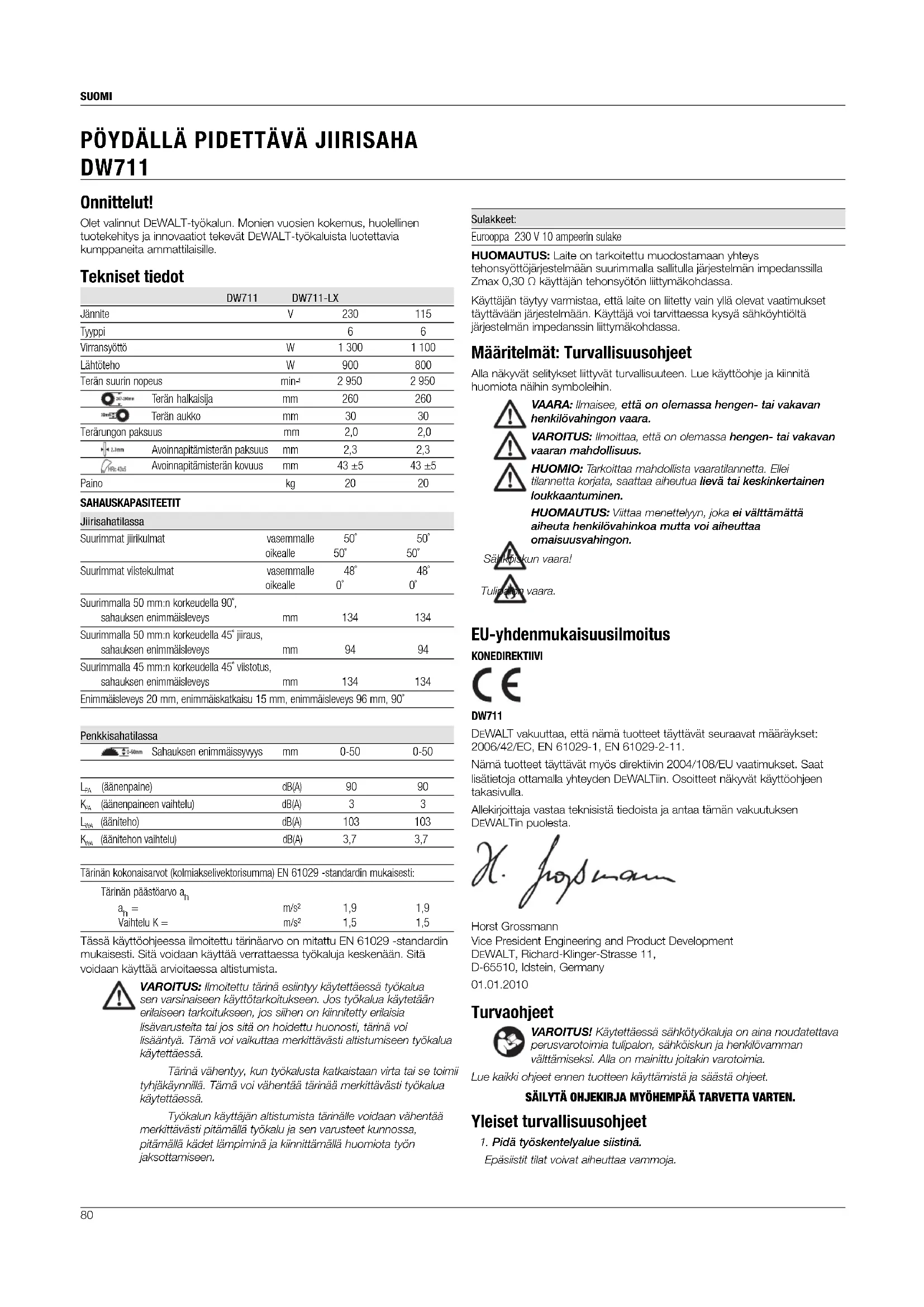 DW711 Sulakkeet: Eurooppa 230 V 10 ampeerin sulake HUOMAUTUS: Laite on tarkoitettu muodostamaan yhteys tehonsyöttöjärjestelmään suurimmalla sallitulla järjestelmän impedanssilla Zmax 0,30 Ω käyttäjän tehonsyötön liittymäkohdassa. Käyttäjän täytyy varmistaa, että laite on liitetty vain yllä olevat vaatimukset täyttävään järjestelmään. Käyttäjä voi tarvittaessa kysyä sähköyhtiöltä järjestelmän impedanssin liittymäkohdassa. Määritelmät: Turvallisuusohjeet Alla näkyvät selitykset liittyvät turvallisuuteen. Lue käyttöohje ja kiinnitä huomiota näihin symboleihin. VAARA: Ilmaisee, että on olemassa hengen- tai vakavan henkilövahingon vaara. VAROITUS: Ilmoittaa, että on olemassa hengen- tai vakavan vaaran mahdollisuus. HUOMIO: Tarkoittaa mahdollista vaaratilannetta. Ellei tilannetta korjata, saattaa aiheutua lievä tai keskinkertainen loukkaantuminen. HUOMAUTUS: Viittaa menettelyyn, joka ei välttämättä aiheuta henkilövahinkoa mutta voi aiheuttaa omaisuusvahingon. Sähköiskun vaara! Tulipalon vaara. EU-yhdenmukaisuusilmoitus KONEDIREKTIIVI DW711 DEWALT vakuuttaa, että nämä tuotteet täyttävät seuraavat määräykset: 2006/42/EC, EN 61029-1, EN 61029-2-11. Nämä tuotteet täyttävät myös direktiivin 2004/108/EU vaatimukset. Saat lisätietoja ottamalla yhteyden DEWALTiin. Osoitteet näkyvät käyttöohjeen takasivulla. Allekirjoittaja vastaa teknisistä tiedoista ja antaa tämän vakuutuksen DEWALTin puolesta. Horst Grossmann Vice President Engineering and Product Development DEWALT, Richard-Klinger-Strasse 11, D-65510, Idstein, Germany