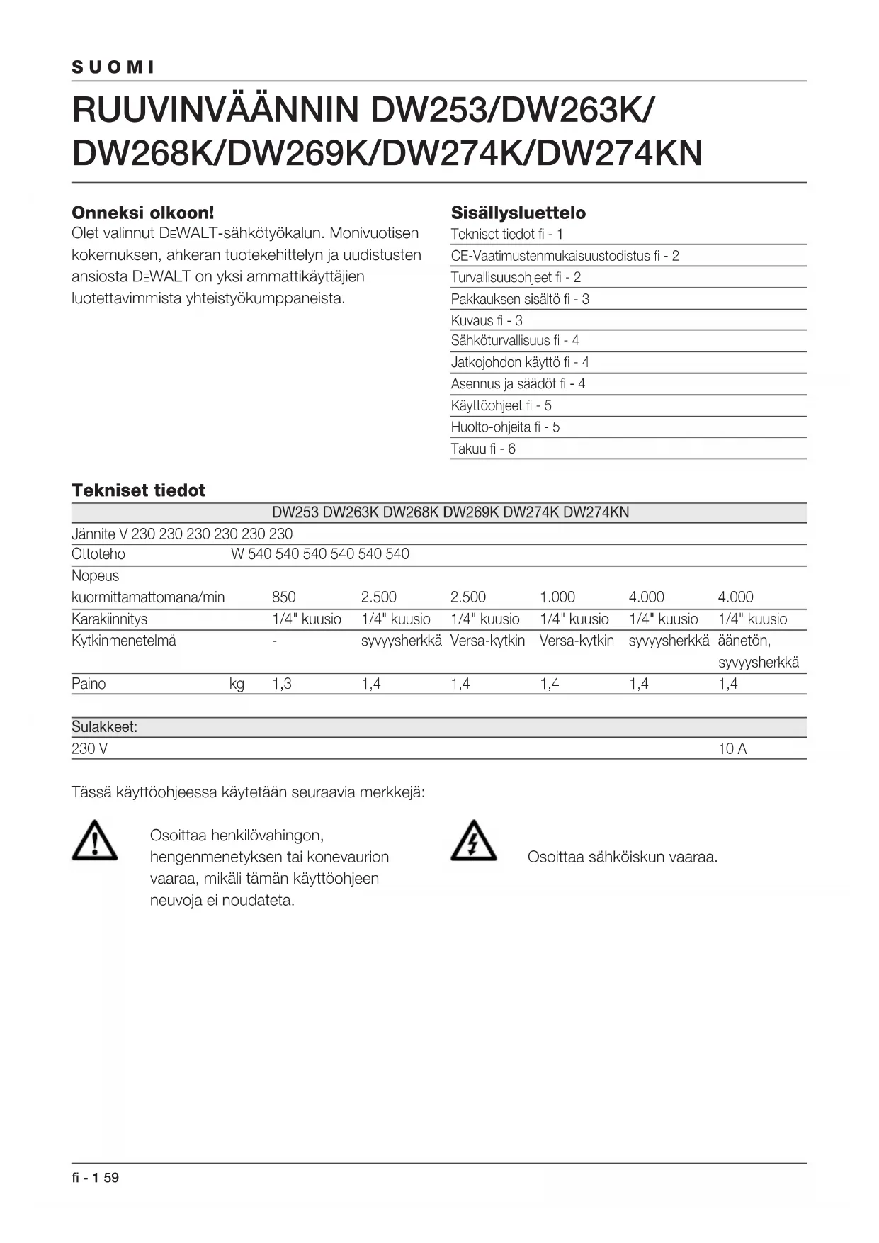 DW268K/DW269K/DW274K/DW274KN Onneksi olkoon! Olet valinnut DEWALT-sähkötyökalun. Monivuotisen kokemuksen, ahkeran tuotekehittelyn ja uudistusten ansiosta DEWALT on yksi ammattikäyttäjien luotettavimmista yhteistyökumppaneista. Sisällysluettelo Tekniset tiedot fi - 1 CE-Vaatimustenmukaisuustodistus fi - 2 Turvallisuusohjeet fi - 2 Pakkauksen sisältö fi - 3 Kuvaus fi - 3 Sähköturvallisuus fi - 4 Jatkojohdon käyttö fi - 4 Asennus ja säädöt fi - 4 Käyttöohjeet fi - 5 Huolto-ohjeita fi - 5 Takuu fi - 6 Tekniset tiedot DW253 DW263K DW268K DW269K DW274K DW274KN Jännite V 230 230 230 230 230 230 Ottoteho W 540 540 540 540 540 540 Nopeus kuormittamattomana/min 850 2.500 2.500 1.000 4.000 4.000 Karakiinnitys 1/4" kuusio 1/4" kuusio 1/4" kuusio 1/4" kuusio 1/4" kuusio 1/4" kuusio Kytkinmenetelmä - syvyysherkkä Versa-kytkin Versa-kytkin syvyysherkkä äänetön, syvyysherkkä Paino kg 1,3 1,4 1,4 1,4 1,4 1,4 Sulakkeet: 230 V 10 A Tässä käyttöohjeessa käytetään seuraavia merkkejä: Osoittaa henkilövahingon, hengenmenetyksen tai konevaurion vaaraa, mikäli tämän käyttöohjeen neuvoja ei noudateta. Osoittaa sähköiskun vaaraa.60 fi - 2 SUOMI CE-Vaatimustenmukaisuustodistus DW253/DW263K/DW268K/DW269K/DW274K/ DW274KN DEWALT vakuuttaa, että sähkökoneet on valmistettu Euroopan Unionin standardien 89/392/EEC, 89/336/EEC, 73/23/EEC, EN 50144, EN 55104 / EN 55014-2, EN 55014, EN 61000-3-2 ja EN 61000-3-3 mukaisesti. Lisätietoja saat DEWALTtilta allaolevasta osoitteesta tai käsikirjan takakannesta. Äänenpainetaso on Euroopan Unionin standardien 86/188/EEC ja 89/392/EECmukainen, mitattu EN 50144:n mukaisesti: DW253 DW263K DW268K DW269K DW274K DW274KN