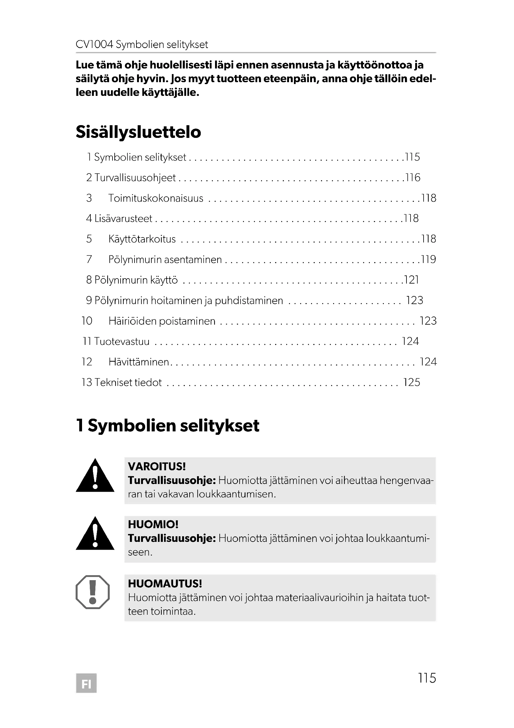 - Lue tämä ohje huolellisesti läpi ennen asennusta ja käyttöönottoa ja säilytä ohje hyvin. Jos myyt tuotteen eteenpäin, anna ohje tällöin edel- leen uudelle käyttäjälle. Sisällysluettelo 1 Symbolien selitykset p. 115