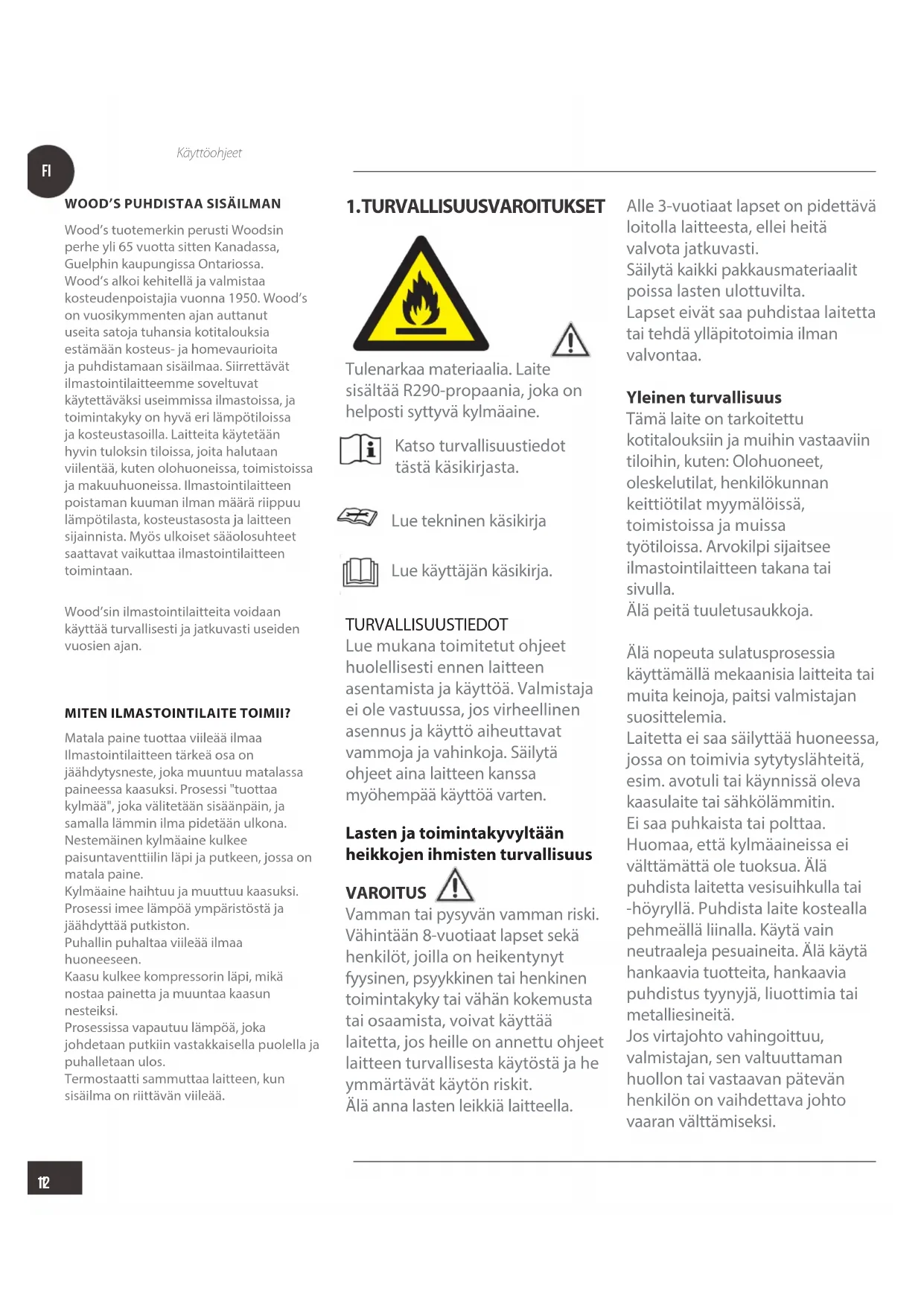 - Kaikki laitteen lisävarusteet tulee säilyttää samassa paikassa asianmukaisesti suojattuina. Kunnossapito Puhdista kondensaattori Wood’sin puhdistusaineella. Lue lisää laitteen puhdistamisesta osoitteesta woods.se Puhdista laite pehmeällä kostealla liinalla. Älä käytä liuottimia tai voimakkaita puhdistusaineita, sillä ne saattavat vaurioittaa laitteen pintaa. Huolto Jos ilmastointilaite on huollettava, ota ensin yhteyttä paikalliseen jälleenmyyjään. Kaikki takuuvaatimukset edellyttävät ostotodistusta.