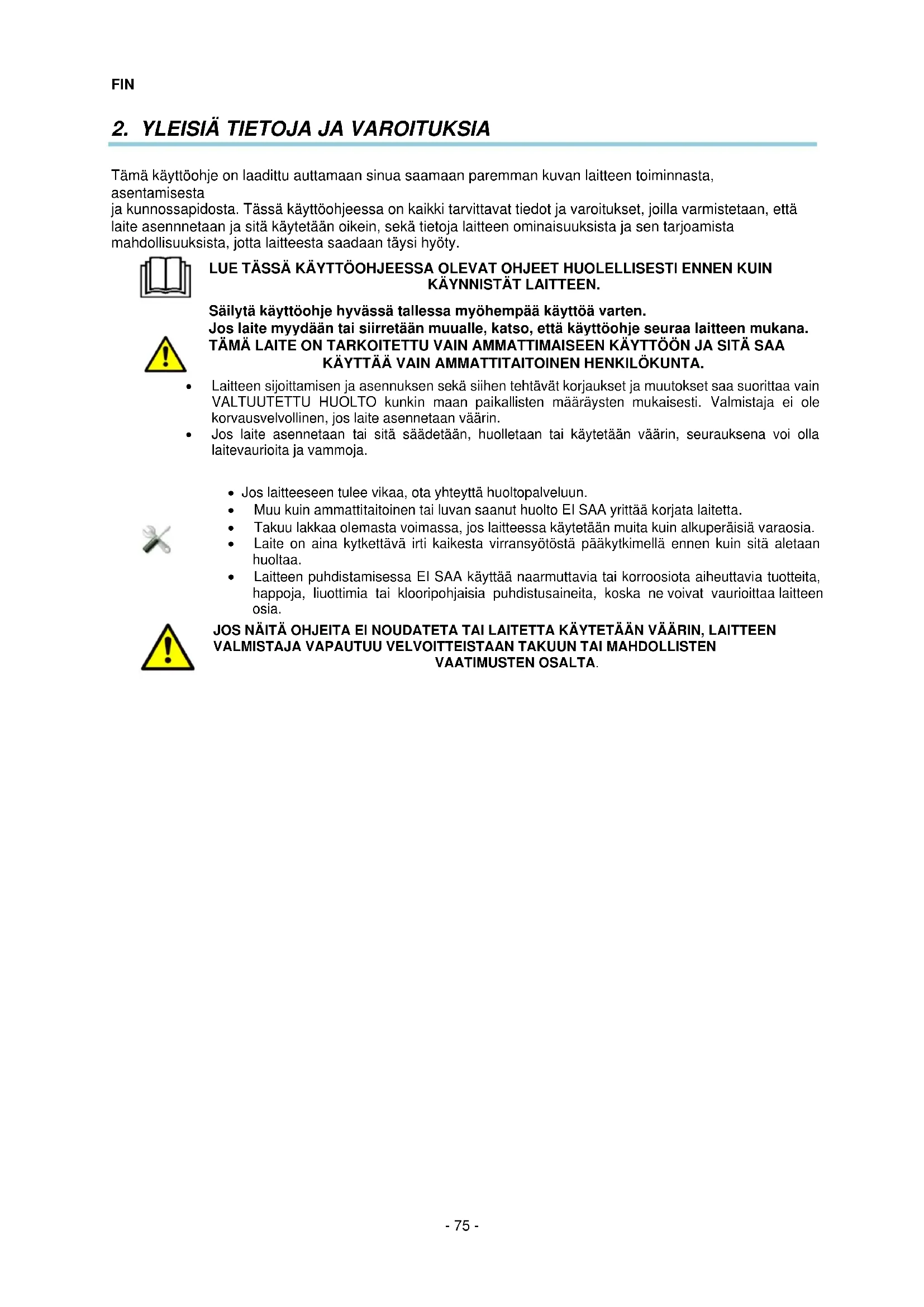 - Muu kuin ammattitaitoinen tai luvan saanut huolto EI SAA yrittää korjata laitetta.