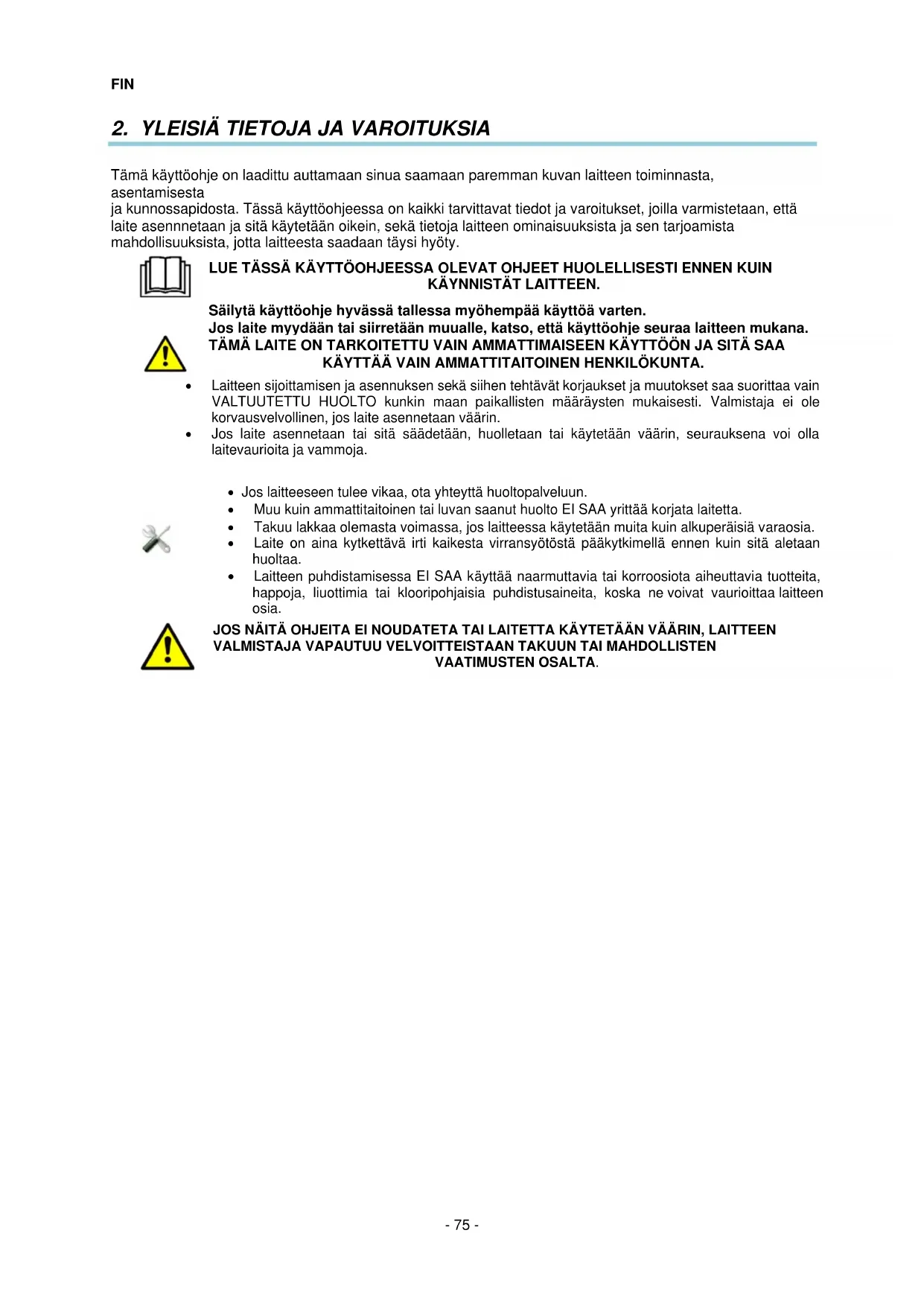 - Muu kuin ammattitaitoinen tai luvan saanut huolto EI SAA yrittää korjata laitetta.