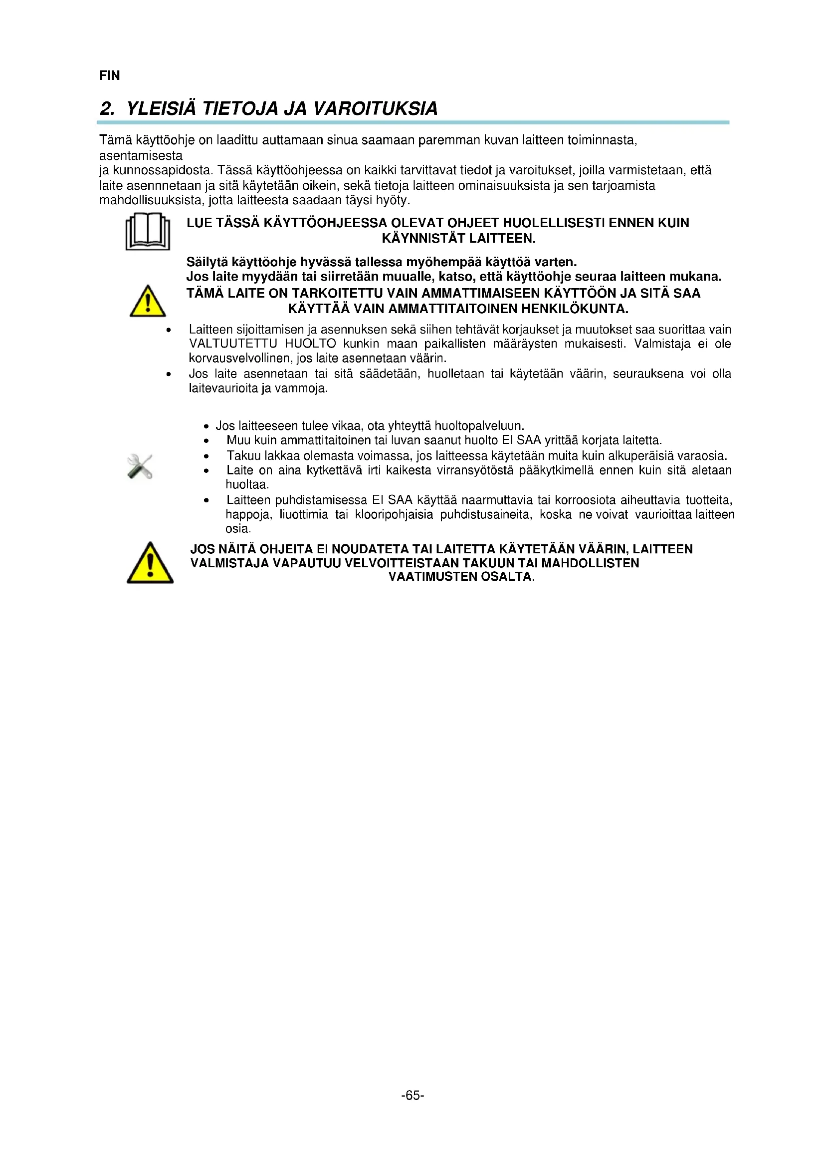 - Muu kuin ammattitaitoinen tai luvan saanut huolto EI SAA yrittää korjata laitetta.