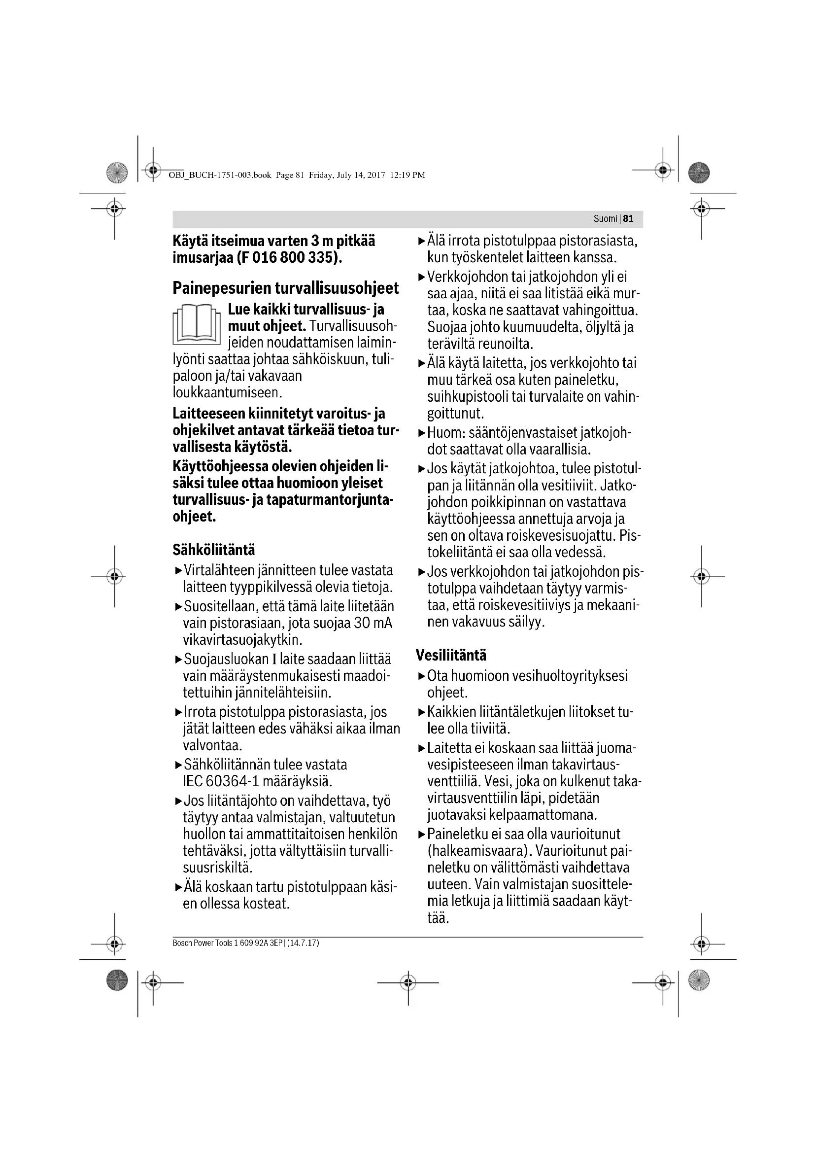 OBJ_BUCH-1751-003.book Page 84 Friday, July 14, 2017 12:19 PM Ω 0,358Suomi | 85 Bosch Power Tools 1 609 92A 3EP | (14.7.17) Ota huomioon jatkojohdon tai kaapelikelan valmistajan käyt- töohje sekä kansalliset määräykset niiden käytöstä. Kysy epävarmoissa tapauksissa sähkömieheltä tai lähimmäs- tä Bosch-sopimushuollosta. Ohjeita tuotteille, joita ei myydä alueella GB: HUOMIO: Turvallisuutesi takia on välttämätöntä, että puutar- halaitteen pistotulppa kiinnitetään jatkojohtoon. Jatkojohdon liitin on oltava roiskevesisuojattu, kumia tai kumipäällystei- nen. Jatkojohdossa on oltava vedonpoistin. Veden imeminen avonaisista säiliöistä – Kierrä suodattimella varustettu imuletku (erikoisimuletku- sarja tuote nro F 016 800 335) vesiliitäntään. – Käynnistä laite pienellä paineella. – Anna laitteen lopussa käydä 10 sekuntia, ennen kuin sam- mutat sen. Toista tämä vaihe useita kertoja, kunnes ulos tu- leva vesi on yhtenäistä ja ilman kuplia. Ota huomioon, että laitetta ei saa käyttää ilman vettä. Käyttö Käynnistys Liitä vesiletku (ei kuulu toimitukseen) veden tulopisteeseen ja laitteeseen. Varmista, että käynnistyskytkin on asennossa ”0” ja liitä laite verkkopistorasiaan. Avaa vesihana. Paina käynnistysvarmistinta , jotta liipaisin vapautuu. Paina liipaisin pohjaan, kunnes vesi virtaa tasaisesti, eikä laitteessa tai paineletkussa enää ole ilmaa. Päästä liipaisin vapaaksi. Suuntaa suihkupistooli alaspäin. Paina käynnistysvarmistinta , jotta liipaisin vapautuu. Paina liipaisin pohjaan. Paina käynnistyskytkintä. Autostop-toiminta Laitteen moottori pysähtyy heti, kun pistoolikahvassa olevaa liipaisinta vapautetaan. Työskentelyohjeita Yleistä Varmista, että painepesuri seisoo tasaisella alustalla. Älä siirrä paineletkua liian kauas äläkä vedä painepesuria pai- neletkusta. Tämä saattaa johtaa siihen, että painepesuri ei enää seiso tukevasti vaan kaatuu. Älä taita paineletkua äläkä aja sen yli ajoneuvolla. Suojaa pai- neletkua teräviltä reunoilta ja kulmilta. Älä käytä tehosuutinta auton pesuun. Älä tee mitään luvattomia muutoksia tai säätöjä varoventtii- liin. Öljyn mittatikku Painepesuri toimitetaan varastointia varten öljyn sulkukan- nella ja käyttöä varten kannella, jossa on tuuletusaukko (öljyn mittatikku). Työskentelyohjeita työskentelyyn puhdistusai- neiden kanssa Käytä ainoastaan puhdistusaineita, jotka on tarkoitet- tu nimenomaan painepesuria varten. Suosittelemme käyttämään puhdistusainetta säästeliäästi ympäristönsuojelun takia. Noudata säiliöön merkityt laimen- nussuositukset. Bosch takaa laitteen häiriöttömän käytön tarjoamalla valikoi- man puhdistus- ja säilöntäaineita. Suositeltu puhdistusmenetelmä Vaihe 1: lian irrotus Suihkuta puhdistusainetta säästeliäästi kohteeseen ja anna sen vaikuttaa vähän aikaa. Vaihe 2: lian poisto Poista liuotettu lika suurella paineella. Huomio: Aloita alhaalta ja työskentele ylöspäin pystysuoria pintoja puhdistettaessa puhdistusainetta käyttäen. Huuhtele työskentelemällä ylhäältä alaspäin. Vianetsintä Vian oire Mahdolliset vikalähteet Korjaus Moottori ei käynnisty Pistotulppaa ei olla liitetty pistorasiaan Liitä pistotulppa pistorasiaan Pistorasia on viallinen Käytä toista pistorasiaa Sulake on lauennut Vaihda sulake Jatkojohto on vaurioitunut Kokeile ilman jatkojohtoa Moottorin suojakytkin on lauennut Anna moottorin jäähtyä 15 min. Jäätynyt Anna pumpun, vesiletkun tai lisätarvik- keen sulata Moottori pysähtyy Sulake on lauennut Vaihda sulake Verkkojännite on väärä Tarkista verkkojännite, sen tulee vastata tyyppikilven merkintää Moottorin suojakytkin on lauennut Anna moottorin jäähtyä 15 min. Sulake laukeaa Sulake on liian pieni Liitä virtapiiriin, jonka sulake sopii paine- pesurin teholle OBJ_BUCH-1751-003.book Page 85 Friday, July 14, 2017 12:19 PM86 | Suomi 1 609 92A 3EP | (14.7.17) Bosch Power Tools Hoito ja huolto Huolto Irrota pistotulppa pistorasiasta ja veden tuloletku vesi- liitännästä ennen kaikkia töitä. Huomio: Suorita seuraavat huoltotoimenpiteet säännöllises- ti, takaaksesi pitkän ja luotettavan käyttöajan. Tarkista säännöllisesti, ettei laitteessa ole ilmeisiä puutteita, kuten irtonainen liitos ja kuluneet tai vaurioituneet osat. Tarkista, että suojukset ja suojalaitteet ovat kunnossa ja oi- kein asennettu. Suorita mahdolliset huolto- ja korjaustyöt en- nen käyttöä. Käytön jälkeen/säilytys Puhdista painepesuri ulkoa pehmeällä harjalla ja rievulla. Vet- tä, liuotinta tai kiillotusainetta ei saa käyttää. Poista kaikki li- ka, etenkin moottorin tuuletusaukoista. Varastointi kauden lopun jälkeen: tyhjennä kaikki vesi pum- pusta käyttämällä moottoria muutaman sekunnin ja painamal- la liipaisinta. Älä aseta muita esineitä laitteen päälle. Varmista, että johdot eivät joudu puristukseen. Älä taita pai- neletkua. Asiakaspalvelu ja käyttöneuvonta www.bosch-do-it.com Ilmoita kaikissa kyselyissä ja varaosatilauksissa 10-numeroi- nen tuotenumero, joka löytyy sähkölaitteen mallikilvestä. Moottori käy, mutta ei muodosta painetta Suutin osittain tukossa Puhdista suutin Moottorin ääni kuuluu, mutta painepesuri ei toimi Riittämätön verkkojännite Tarkista, että sähköverkon jännite vastaa tyyppikilven tietoja Liian alhainen jännite jatkojohdon takia Tarkista, että jatkojohto on sopiva Laitetta ei ole käytetty pitkään aikaan Käänny Bosch-sopimushuollon puoleen Autostop-toiminto aiheuttaa ongelmia Käänny Bosch-sopimushuollon puoleen Sykkivä paine Ilmaa vesiletkussa tai pumpussa Anna painepesurin käydä avoimella suih- kupistoolilla, avatulla vesihanalla ja pie- nellä paineella, kunnes tasainen työpaine on saavutettu Veden syöttö ei ole kunnossa Tarkista, että vesiliitäntä vastaa merkin- töjä teknisissä tiedoissa. Pienimmät vesi- letkut, joita saa käyttää ovat 1/2" tai Ø 13 mm Vedensuodatin tukossa P