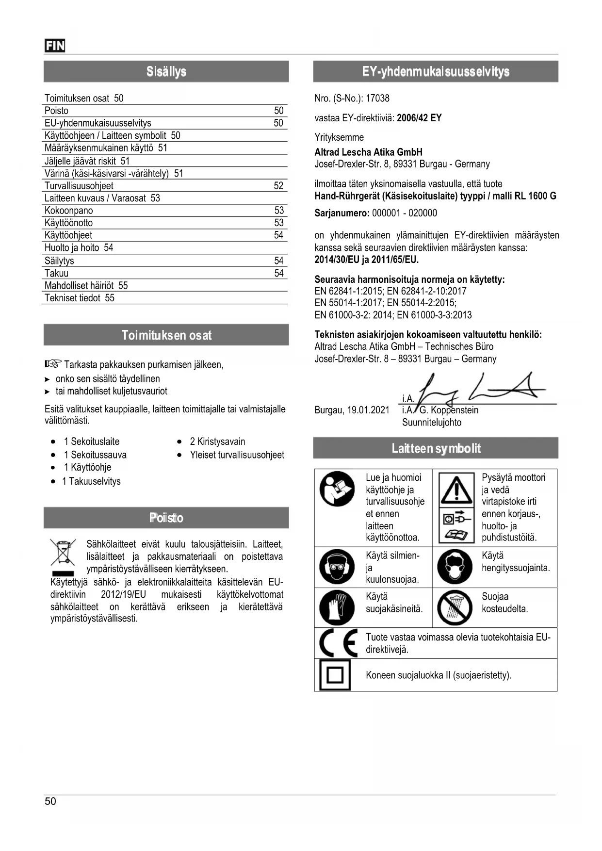 Nro. (S-No.): 17038 vastaa EY-direktiiviä: 2006/42 EY Yrityksemme Altrad Lescha Atika GmbH Josef-Drexler-Str. 8, 89331 Burgau - Germany ilmoittaa täten yksinomaisella vastuulla, että tuote Hand-Rührgerät (Käsisekoituslaite) tyyppi / malli RL 1600 G Sarjanumero: 000001 - 020000 on yhdenmukainen ylämainittujen EY-direktiivien määräysten kanssa sekä seuraavien direktiivien määräysten kanssa: 2014/30/EU ja 2011/65/EU. Seuraavia harmonisoituja normeja on käytetty: EN 62841-1:2015; EN 62841-2-10:2017 EN 55014-1:2017; EN 55014-2:2015; EN 61000-3-2: 2014; EN 61000-3-3:2013 Teknisten asiakirjojen kokoamiseen valtuutettu henkilö: Altrad Lescha Atika GmbH – Technisches Büro Josef-Drexler-Str. 8 – 89331 Burgau – Germany