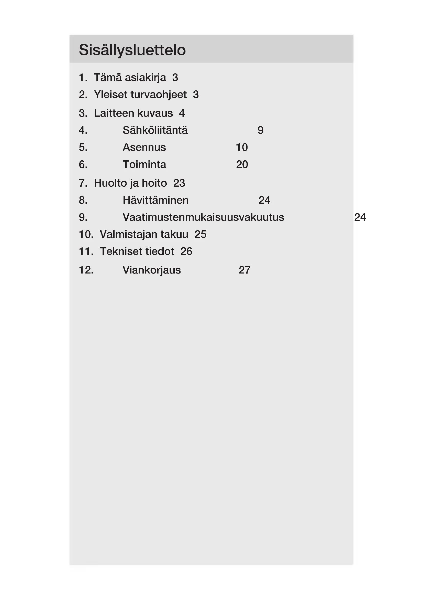 - Puhdista laite vain hieman kostutetulla liinalla ilman puhdistusaineita. Tärkeää: Käyttölaitetta ei voi vaihtaa uuteen.– 24 – Sisällysluettelo