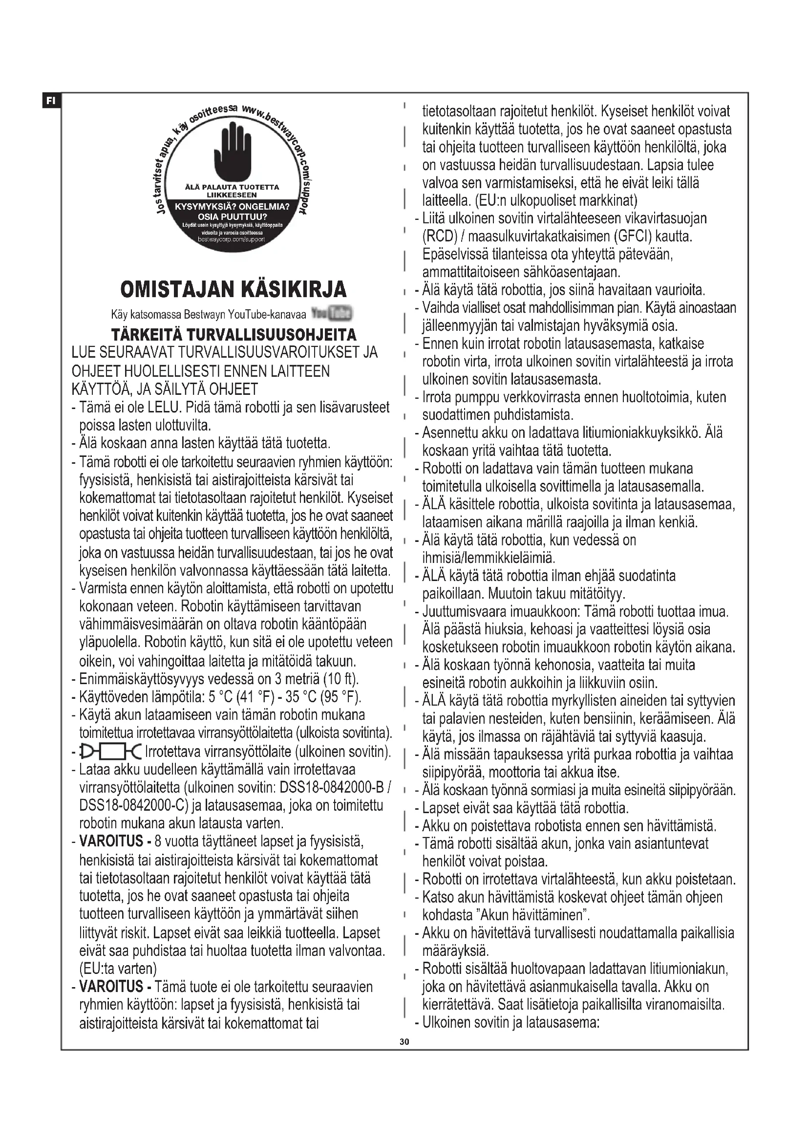 klipsiä ja nostamalla akku sitten pois. HUOMAA: Kierrä liittimen päähän eristysteippiä, jotta kummankin liittimen koskettaminen ei aiheuta oikosulkua. Sähköromua ei tule hävittää kotitalousjätteen mukana. Vie asianmukaisiin keräys- ja kierrätyspisteisiin. Tarkista kierrätysohjeet paikallisilta viranomaisilta tai jälleenmyyjältä.36 Roskia karkaa robotista Roskat pääsevät suodatinkannen ulkopuolelle Pyöreä kelluke uppoaa Robottia ei voi ladata / ladata uudelleen Vaihda uuteen. Saat lisätietoja ja apua sivustomme Support-osasta osoitteessa www.bestwaycorp.com. Irrota nivelpää ja tasoitusrengas oppaan kohdan ”Akun irrottaminen” mukaan, ja sitten: - Poista juuttuneet roskat - Tarkista, että tasoitusrengas ja pohjalevy on asennettu oikein (katso kuvat alla). - Tarkista tasoitusrengas vaurioiden ja kulumisen varalta. Vaihda tarvittaessa tilalle uusi. Imusuun läppä (puhdistimen pohjassa) on rikki Imusuulle on kertynyt roskia, mikä estää läppää sulkeutumasta Korvaa uudella kellukkeella. Saat lisätietoja ja apua sivustomme Support-osasta osoitteessa www.bestwaycorp.com. Saat lisätietoja ja apua sivustomme Support-osasta osoitteessa www.bestwaycorp.com. VAROITUS! ÄLÄ vaihda akkua itse. Tämä voi aiheuttaa vakavan tai hengenvaarallisen loukkaantumisen ja mitätöi takuun. Saat lisätietoja ja apua sivustomme Support-osasta osoitteessa www.bestwaycorp.com. VAROITUS! Vääränlaisen ulkoisen adapterin käyttö vioittaa robottia/akkua ja mitätöi takuun. Varmista, että latausasema on liitetty oikein ja kunnolla ulkoiseen sovittimeen ja robottiin. Katso lisätietoja käyttöoppaasta. Imusuun läppä toimii oven tapaan estäen roskien karkaamisen säiliöstä. Saat lisätietoja ja apua sivustomme Support-osasta osoitteessa www.bestwaycorp.com. Latausasema ei ole kytketty kunnolla ulkoiseen sovittimeen ja robottiin Nivelpää ei käänny tai kääntyy huomattavan hitaasti Robotti toimii ilmoitettua lyhyemmän aikaa Tarkista sivuläppiä mahdollisesti haittaavat roskat ja poista ne. Poista imuaukon tukkivat roskat. Lataa robottia vähintään 6 tuntia. Sivuläppä ei nouse ylös Nivelpään pohja on jumissa Suodatinkannen verkko on vahingoittunut Kelluke on rikki ja vesi vuotaa sisään Akku ei ole ladattu täyteen Akku on vioittunut Ulkoinen adapteri ei toimi.BELANGRIJKE VEILIGHEIDSVOORSCHRIFTEN