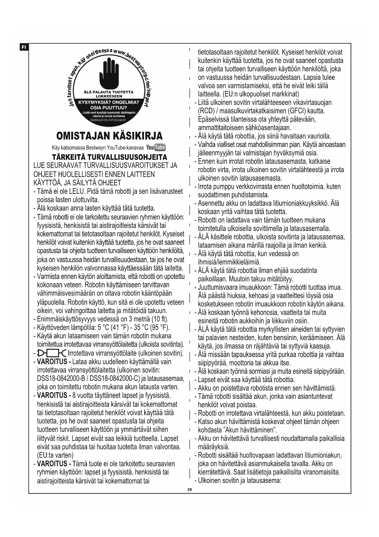 - Tämä ei ole LELU. Pidä tämä robotti ja sen lisävarusteet poissa lasten ulottuvilta. - Älä koskaan anna lasten käyttää tätä tuotetta. - Tämä robotti ei ole tarkoitettu seuraavien ryhmien käyttöön: fyysisistä, henkisistä tai aistirajoitteista kärsivät tai kokemattomat tai tietotasoltaan rajoitetut henkilöt. Kyseiset henkilöt voivat kuitenkin käyttää tuotetta, jos he ovat saaneet opastusta tai ohjeita tuotteen turvalliseen käyttöön henkilöltä, joka on vastuussa heidän turvallisuudestaan, tai jos he ovat kyseisen henkilön valvonnassa käyttäessään tätä laitetta. - Varmista ennen käytön aloittamista, että robotti on upotettu kokonaan veteen. Robotin käyttämiseen tarvittavan vähimmäisvesimäärän on oltava robotin kääntöpään yläpuolella. Robotin käyttö, kun sitä ei ole upotettu veteen oikein, voi vahingoittaa laitetta ja mitätöidä takuun. - Enimmäiskäyttösyvyys vedessä on 3 metriä (10 ft). - Käyttöveden lämpötila: 5 °C (41 °F) - 35 °C (95 °F). - Käytä akun lataamiseen vain tämän robotin mukana toimitettua irrotettavaa virransyöttölaitetta (ulkoista sovitinta). - Irrotettava virransyöttölaite (ulkoinen sovitin). - VAROITUS - Lataa akku uudelleen käyttämällä vain irrotettavaa virransyöttölaitetta (ulkoinen sovitin: DSS18-0842000-B / DSS18-0842000-C) ja latausasemaa, joka on toimitettu robotin mukana akun latausta varten. - VAROITUS - 8 vuotta täyttäneet lapset ja fyysisistä, henkisistä tai aistirajoitteista kärsivät tai kokemattomat tai tietotasoltaan rajoitetut henkilöt voivat käyttää tätä tuotetta, jos he ovat saaneet opastusta tai ohjeita tuotteen turvalliseen käyttöön ja ymmärtävät siihen liittyvät riskit. Lapset eivät saa leikkiä tuotteella. Lapset eivät saa puhdistaa tai huoltaa tuotetta ilman valvontaa. (EU:ta varten) - VAROITUS - Tämä tuote ei ole tarkoitettu seuraavien ryhmien käyttöön: lapset ja fyysisistä, henkisistä tai aistirajoitteista kärsivät tai kokemattomat tai tietotasoltaan rajoitetut henkilöt. Kyseiset henkilöt voivat kuitenkin käyttää tuotetta, jos he ovat saaneet opastusta tai ohjeita tuotteen turvalliseen käyttöön henkilöltä, joka on vastuussa heidän turvallisuudestaan. Lapsia tulee valvoa sen varmistamiseksi, että he eivät leiki tällä laitteella. (EU:n ulkopuoliset markkinat) - Liitä ulkoinen sovitin virtalähteeseen vikavirtasuojan (RCD) / maasulkuvirtakatkaisimen (GFCI) kautta. Epäselvissä tilanteissa ota yhteyttä pätevään, ammattitaitoiseen sähköasentajaan. - Älä käytä tätä robottia, jos siinä havaitaan vaurioita. - Vaihda vialliset osat mahdollisimman pian. Käytä ainoastaan jälleenmyyjän tai valmistajan hyväksymiä osia. - Ennen kuin irrotat robotin latausasemasta, katkaise robotin virta, irrota ulkoinen sovitin virtalähteestä ja irrota ulkoinen sovitin latausasemasta. - Irrota pumppu verkkovirrasta ennen huoltotoimia, kuten suodattimen puhdistamista. - Asennettu akku on ladattava litiumioniakkuyksikkö. Älä koskaan yritä vaihtaa tätä tuotetta. - Robotti on ladattava vain tämän tuotteen mukana toimitetulla ulkoisella sovittimella ja latausasemalla. - ÄLÄ käsittele robottia, ulkoista sovitinta ja latausasemaa, lataamisen aikana märillä raajoilla ja ilman kenkiä. - Älä käytä tätä robottia, kun vedessä on ihmisiä/lemmikkieläimiä. - ÄLÄ käytä tätä robottia ilman ehjää suodatinta paikoillaan. Muutoin takuu mitätöityy. - Juuttumisvaara imuaukkoon: Tämä robotti tuottaa imua. Älä päästä hiuksia, kehoasi ja vaatteittesi löysiä osia kosketukseen robotin imuaukkoon robotin käytön aikana. - Älä koskaan työnnä kehonosia, vaatteita tai muita esineitä robotin aukkoihin ja liikkuviin osiin. - ÄLÄ käytä tätä robottia myrkyllisten aineiden tai syttyvien tai palavien nesteiden, kuten bensiinin, keräämiseen. Älä käytä, jos ilmassa on räjähtäviä tai syttyviä kaasuja. - Älä missään tapauksessa yritä purkaa robottia ja vaihtaa siipipyörää, moottoria tai akkua itse. - Älä koskaan työnnä sormiasi ja muita esineitä siipipyörään. - Lapset eivät saa käyttää tätä robottia. - Akku on poistettava robotista ennen sen hävittämistä. - Tämä robotti sisältää akun, jonka vain asiantuntevat henkilöt voivat poistaa. - Robotti on irrotettava virtalähteestä, kun akku poistetaan. - Katso akun hävittämistä koskevat ohjeet tämän ohjeen kohdasta ”Akun hävittäminen”. - Akku on hävitettävä turvallisesti noudattamalla paikallisia määräyksiä. - Robotti sisältää huoltovapaan ladattavan litiumioniakun, joka on hävitettävä asianmukaisella tavalla. Akku on kierrätettävä. Saat lisätietoja paikallisilta viranomaisilta. - Ulkoinen sovitin ja latausasema: