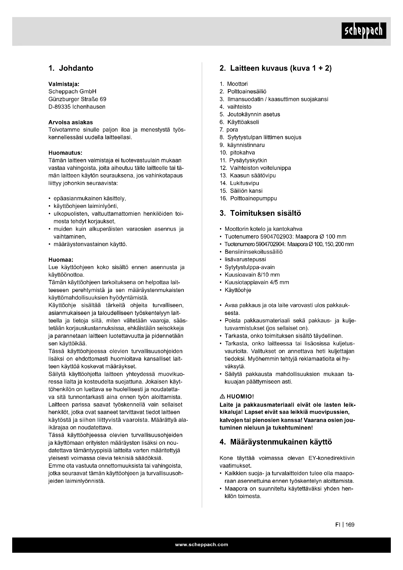 Valmistaja: Scheppach GmbH Günzburger Straße 69 D-89335 Ichenhausen Arvoisa asiakas Toivotamme sinulle paljon iloa ja menestystä työs- kennellessäsi uudella laitteellasi. Huomautus: Tämän laitteen valmistaja ei tuotevastuulain mukaan vastaa vahingoista, joita aiheutuu tälle laitteelle tai tä- män laitteen käytön seurauksena, jos vahinkotapaus liittyy johonkin seuraavista: