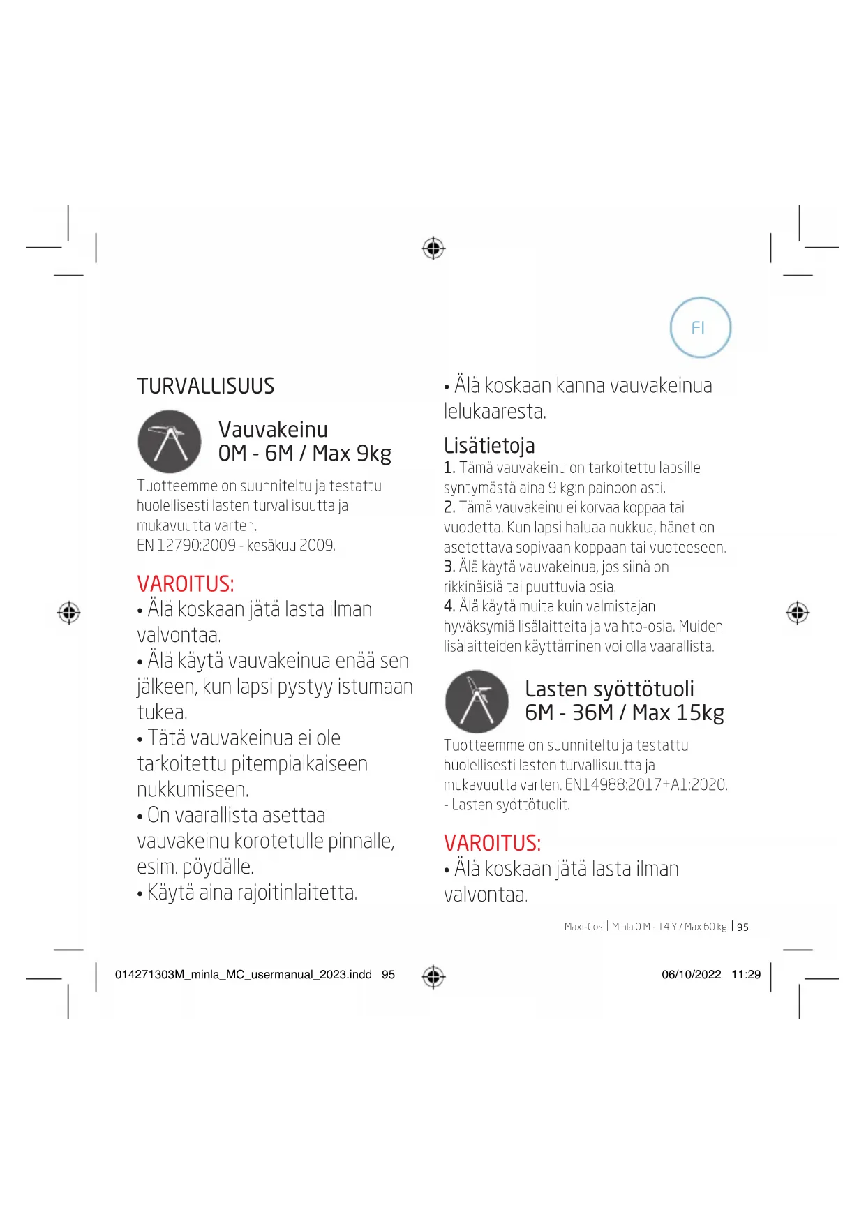 on myyty Dorel-yritysryhmän tytäryhtiön, valtuutetun myyjän tai jälleenmyyjän toimesta. Myöntämämme 24 kuukauden takuu kattaa kaikki materiaali ja valmistusvirheet, olettaen että tuotetta on käytetty normaaliolosuhteissa ja toimittamamme käyttöohjeen mukaisesti.Takuu on voimassa 24 kuukauden ajan ostopäivämäärästä lukien. Jotta voit saada takuun alaisia korjaus- tai varaosapalveluita tuotteen mahdollisten materiaali- tai valmistusvirheiden vuoksi, sinun on esitettävä ostotosite, joka on päivätty huoltopyyntöä edeltävien 24 kuukauden aikana. Myöntämämme 24 kuukauden takuu ei korvaa normaalista kulumisesta, onnettomuudesta, väärinkäytöstä, huollon puutteesta, huolimattomuudesta, tulipalosta, nestekontaktista tai muista ulkoisista syistä aiheutuneita virheitä. Takuu ei myöskään kata käyttöohjeiden noudattamatta jättämisestä aiheutuneita virheitä, toisen tuotteen käytöstä aiheutuneita virheitä, tuotteen luvattomasta käytöstä toisen henkilön taholta aiheutuneita virheitä, tuotteen varastamisesta aiheutuneita virheitä, tuote-etiketin tai tuotteen tunnistamisnumeron poistosta aiheutuneita tai tuotteen muuttamisesta aiheutuneita vaurioita. Esimerkkejä normaalista kulumisesta ovat säännöllisen käytön aiheuttamat kulumat pyörissä ja tekstiileissä ja värien ja materiaalien luonnollinen haalistuminen tuotteen normaalin vanhenemisen vuoksi. Mitä tehdä, jos vikoja ilmenee: Jos ongelmia tai vikoja ilmene, pyydämme Teitä kääntymään valtuutetun jälleenmyyjän puoleen. He hyväksyvät antamamme 24 kuukauden takuun (1) . Sinun on esitettävä ostotosite, joka on päivätty huoltopyyntöä edeltävien 24 kuukauden ajalle. Helpoimmin huoltopyynnön voi esittää esihyväksyttämällä sen meillä. Jos esität tämän takuun kattaman kelvollisen korvausvaatimuksen, voimme pyytää sinua palauttamaan tuotteen valtuutetulle myyjälle ja hyväksymällemme jälleenmyyjälle tai lähettämän tuotteen meille antamiemme ohjeiden mukaisesti. Maksamme lähetys- ja palautuskustannukset, mikäli kaikkia sääntöjä noudatetaan. Vauriot ja/tai viat, 014271303M_minla_MC_usermanual_2023.indd 99014271303M_minla_MC_usermanual_2023.indd 99 06/10/2022 11:2906/10/2022 11:29100