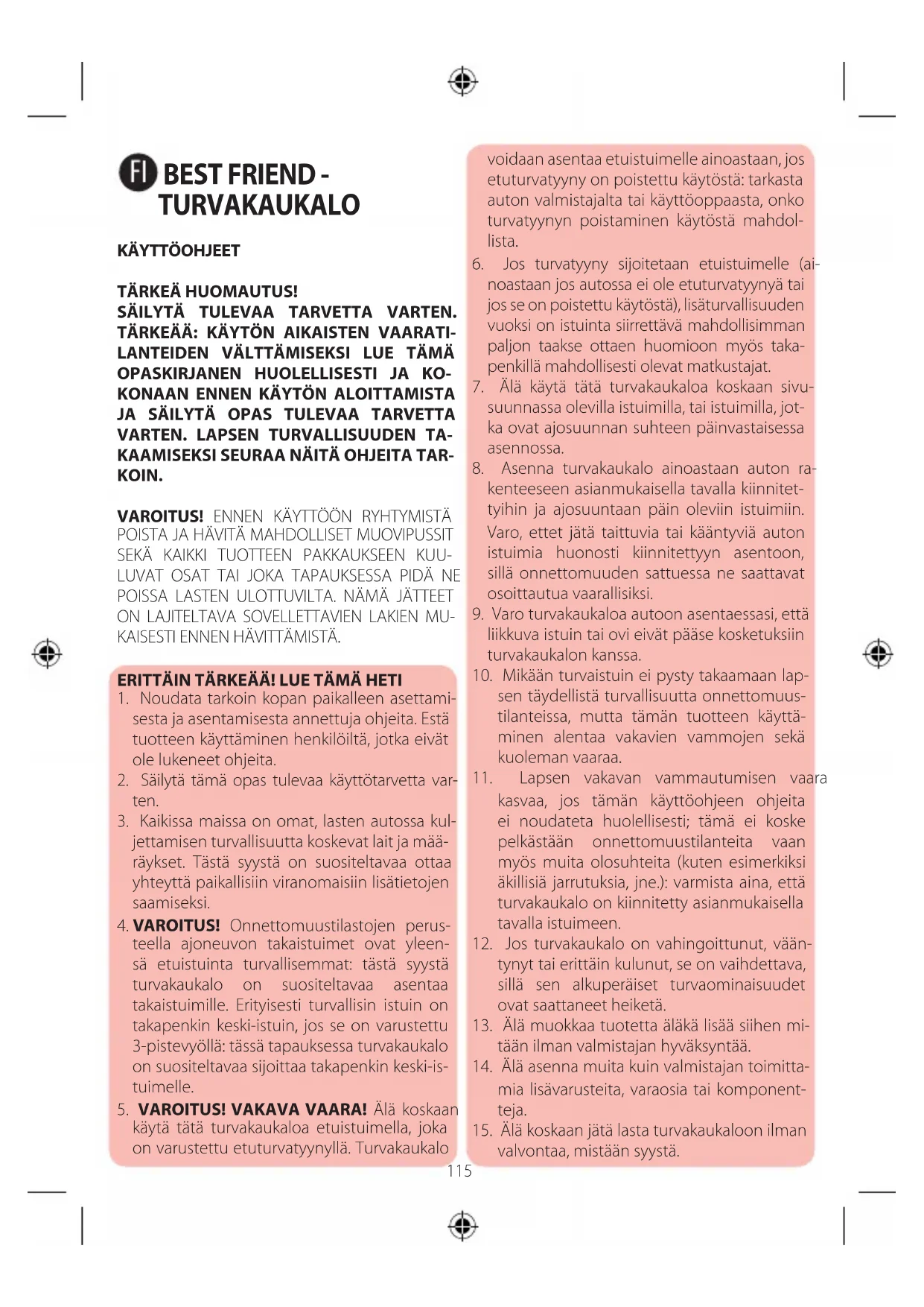 tuimella, joka on varustettu etuturvatyy- nyllä; näin saa tehdä ainoastaan, jos etu- turvatyyny on poistettu käytöstä: tarkasta autosi valmistajalta tai käyttöoppaasta, onko turvatyynyn poistaminen käytöstä mahdollista. VAROITUS! Jos tuotetta käytetään ajoneuvois- sa, joissa takaistuinten turvavöihin on integroi- tu turvatyyny (täyttyvät turvavyöt), ajoneuvon turvavyön täyttyvän osan ja tämän lasten tur- vajärjestelmän yhteisvaikutus saattaa aiheuttaa vakavia vammoja tai kuoleman. Älä asenna tätä lasten turvalaitetta täyttyvää turvavyötä käyttäen. Jos BEST FRIEND -turvakaukalo on varustettu pienennysosalla: VAROITUS! Lapsen turvallisuuden takaami- seksi älä käytä pienennysosaa koskaan, jos lap- sen paino on yli 6 kg.