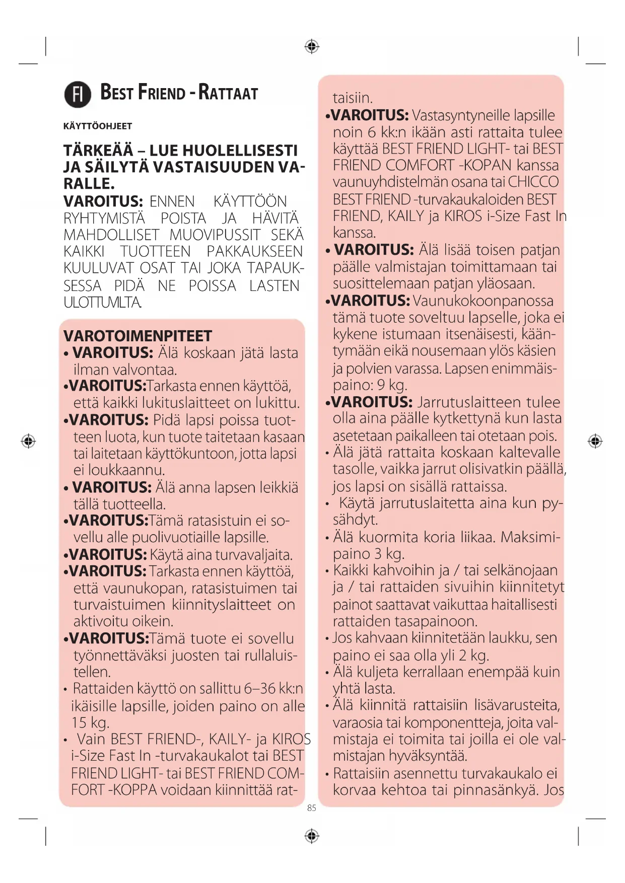 - VAROITUS: Vastasyntyneille lapsille noin 6 kk:n ikään asti rattaita tulee käyttää BEST FRIEND LIGHT- tai BEST FRIEND COMFORT -KOPAN kanssa vaunuyhdistelmän osana tai CHICCO BEST FRIEND -turvakaukaloiden BEST FRIEND, KAILY ja KIROS i-Size Fast In kanssa.
