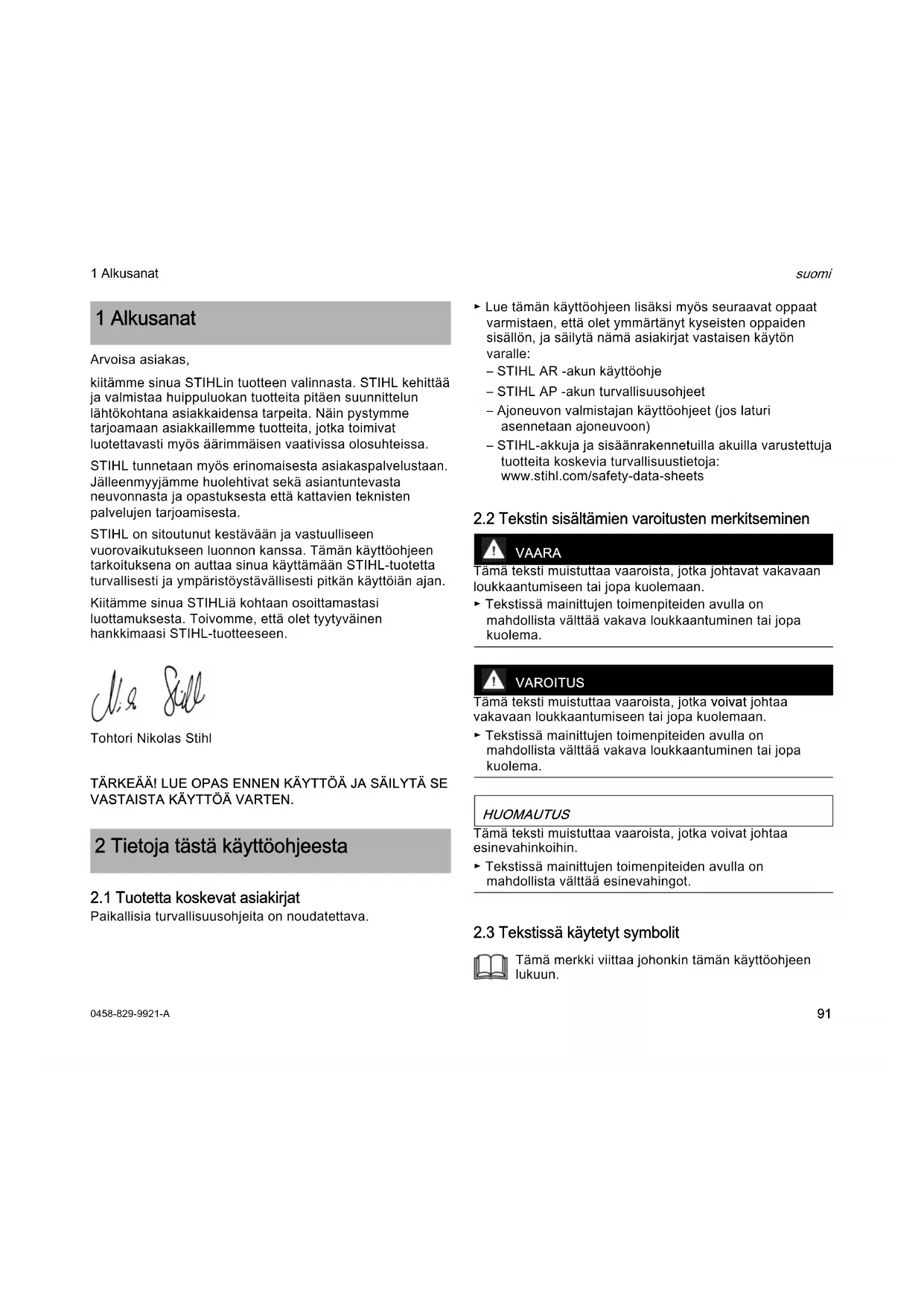 suomi 1 Alkusanat Arvoisa asiakas, kiitämme sinua STIHLin tuotteen valinnasta. STIHL kehittää ja valmistaa huippuluokan tuotteita pitäen suunnittelun lähtökohtana asiakkaidensa tarpeita. Näin pystymme tarjoamaan asiakkaillemme tuotteita, jotka toimivat luotettavasti myös äärimmäisen vaativissa olosuhteissa. STIHL tunnetaan myös erinomaisesta asiakaspalvelustaan. Jälleenmyyjämme huolehtivat sekä asiantuntevasta neuvonnasta ja opastuksesta että kattavien teknisten palvelujen tarjoamisesta. STIHL on sitoutunut kestävään ja vastuulliseen vuorovaikutukseen luonnon kanssa. Tämän käyttöohjeen tarkoituksena on auttaa sinua käyttämään STIHL-tuotetta turvallisesti ja ympäristöystävällisesti pitkän käyttöiän ajan. Kiitämme sinua STIHLiä kohtaan osoittamastasi luottamuksesta. Toivomme, että olet tyytyväinen hankkimaasi STIHL-tuotteeseen. Tohtori Nikolas Stihl TÄRKEÄÄ! LUE OPAS ENNEN KÄYTTÖÄ JA SÄILYTÄ SE VASTAISTA KÄYTTÖÄ VARTEN.