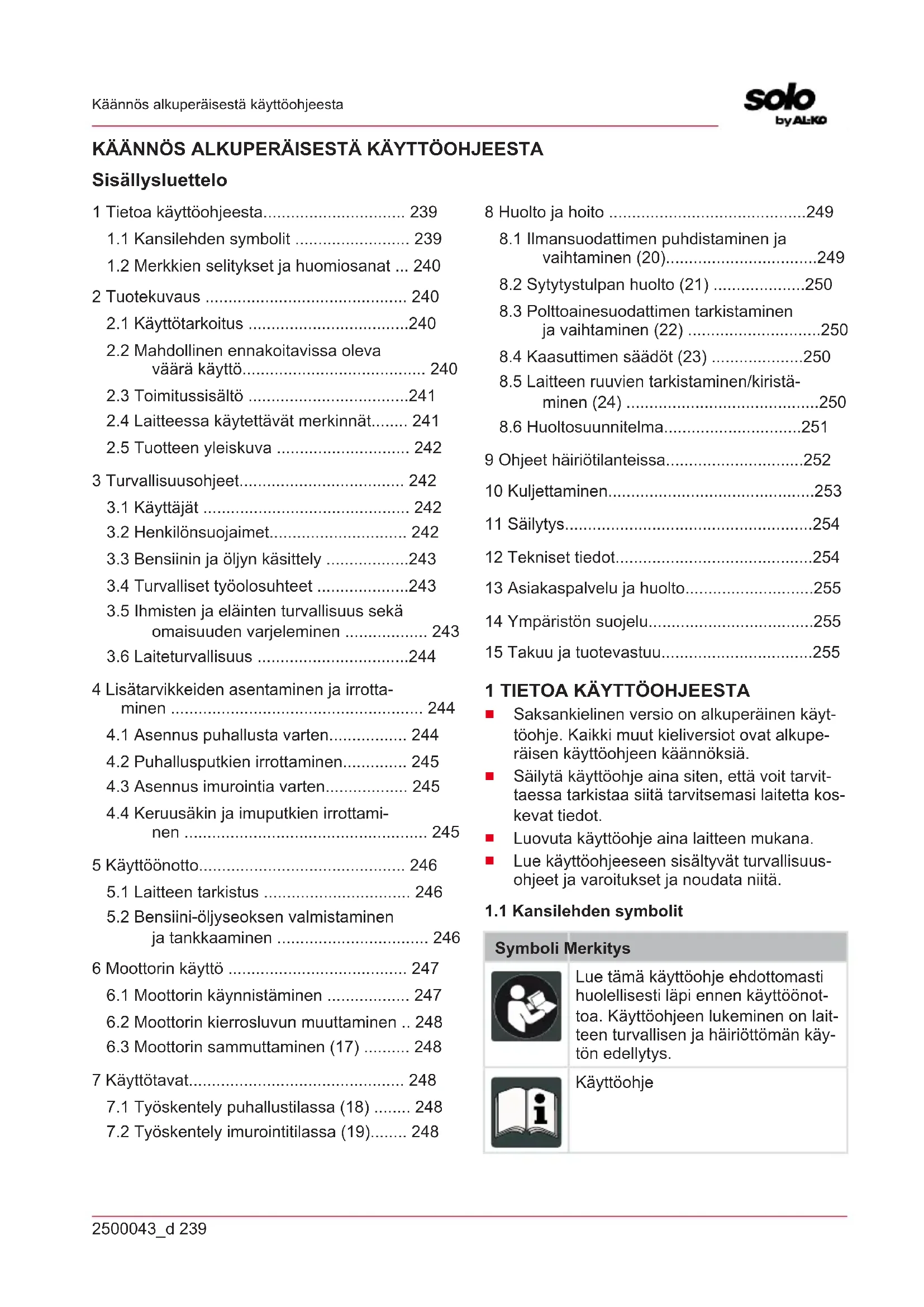 Symboli Merkitys Lue tämä käyttöohje ehdottomasti huolellisesti läpi ennen käyttöönot- toa. Käyttöohjeen lukeminen on lait- teen turvallisen ja häiriöttömän käy- tön edellytys. KäyttöohjeFI 240 2500043_d Tuotekuvaus Symboli Merkitys Älä käytä bensiinillä toimivaa laitetta avotulen tai lämmönlähteiden lähei- syydessä.