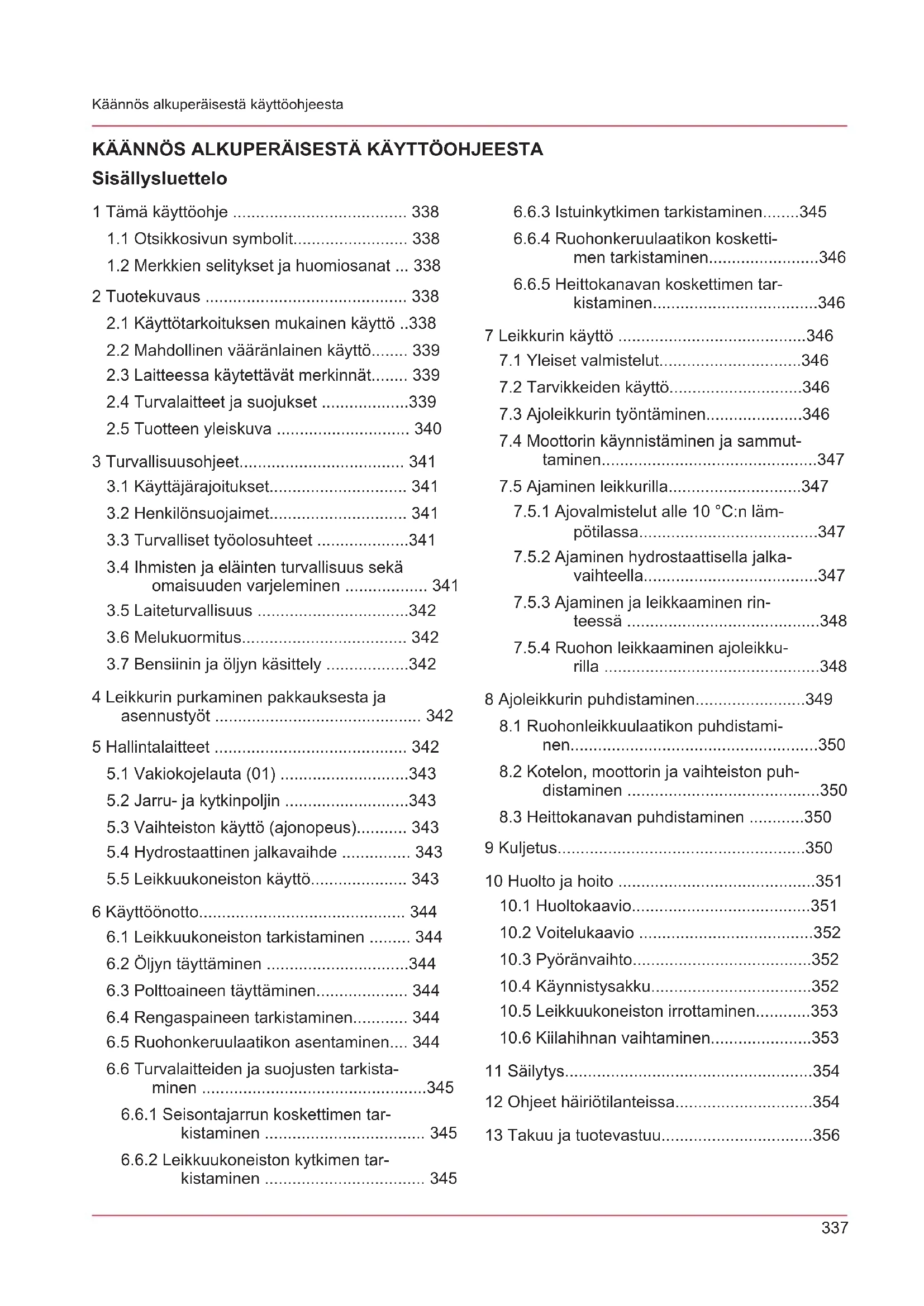 4 Leikkurin purkaminen pakkauksesta ja asennustyöt ............................................. 342 5 Hallintalaitteet .......................................... 342