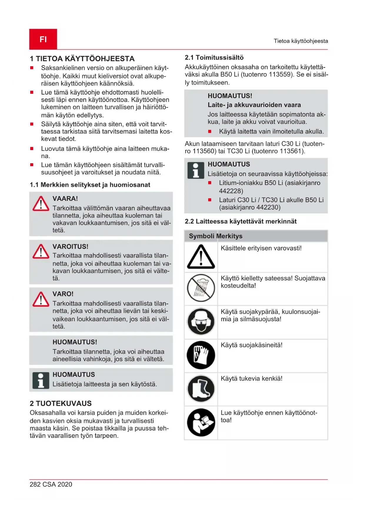 Nro Osa 1 Terälaipan suojus 2 Teleskooppivarsi 3 Öljysäiliön täyttöaukko 4 Teräketju 5 Terälaippa 6 Kiinnitysruuvi 7 Ketjupyörän suojus 8 Oksatuki 9 Öljysäiliön öljysilmä 10 Kiristysruuvi 11 Ketjun kiristysruuvi 12 Akku 13 Virtakytkin 14 Vapautusnuppi 15 Kahva 16 Kantohihnan silmukka 17 KantohihnaFI 284 CSA 2020 Turvallisuus 3 TURVALLISUUS