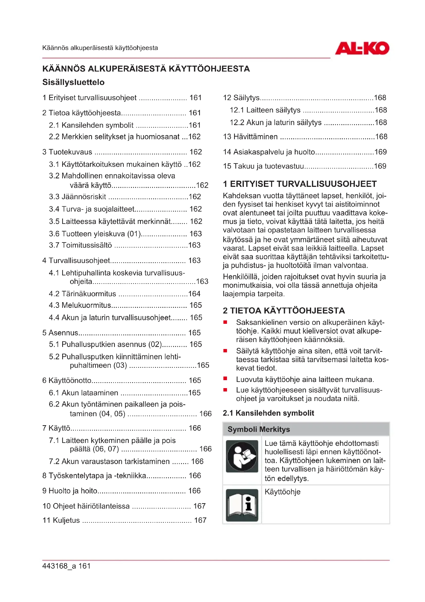 4.4 Akun ja laturin turvallisuusohjeet........ 165