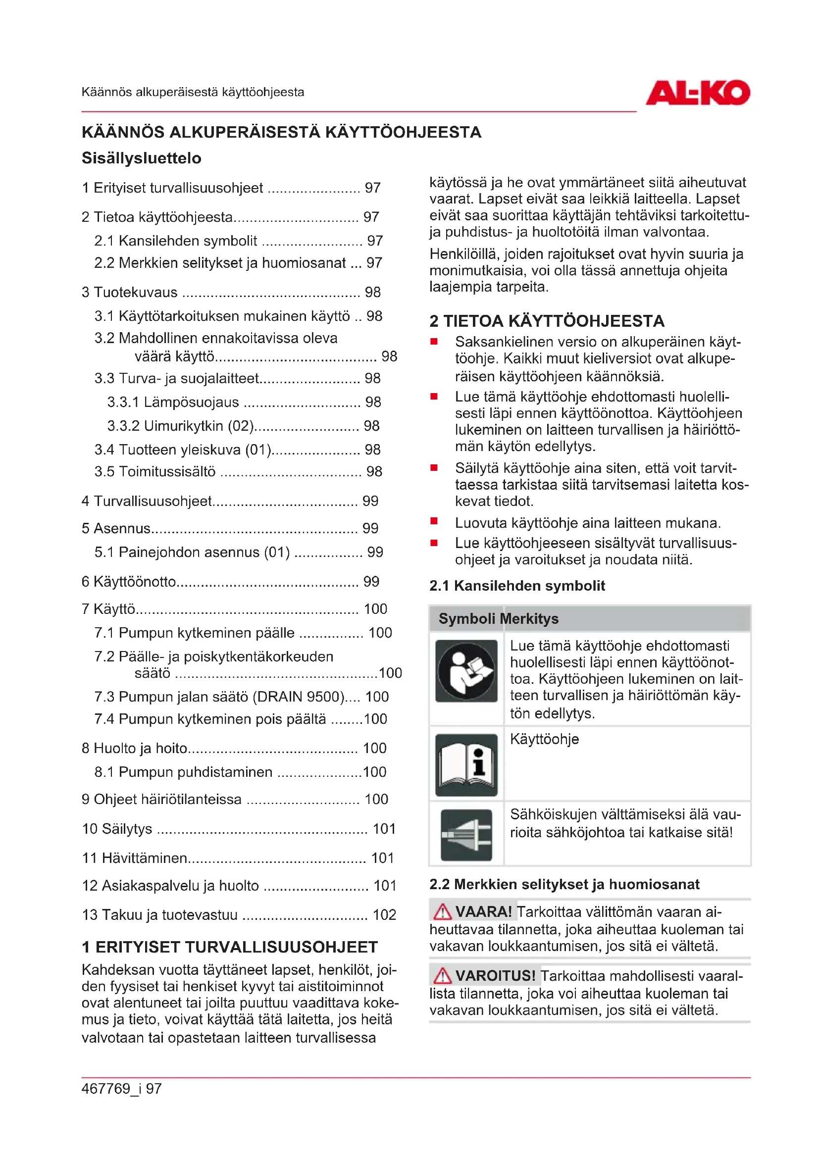 Sähköjärjestelmää koskevia vikoja saa korja- ta ainoastaan sähköalan ammattihenkilö. HUOMAUTUS Jos et pysty korjaamaan vau- rioita, käänny lähimmän asiakaspalvelumme puo- leen.467769_i 101 Säilytys Häiriö Mahdollinen syy Korjaus Moottori ei toimi. Juoksupyörä jumissa. Poista imualueella ole- va lika. Puhdista sopivalla työka- lulla moottorin kotelon takana olevan aukon kautta. Lämpösuoja- kytkin on kyt- kenyt pum- pun pois päältä. Odota, kunnes lämpösuojakyt- kin kytkee pum- pun takaisin päälle. Huomioi kuljetettavan ai- neen maksimi- lämpötila. Tar- kastuta pumppu. Ei verkkojän- nitettä. Tarkista sulak- keet, anna säh- köalan ammatti- laisen tarkastaa virransyöttö. Uimurikytkin ei kytke ve- denpinnan kohotessa. Lähetä pumppu AL-KO-huol- toon. Pumppu on käynnissä, mutta ei kul- jeta nestettä. Ilmaa pum- pun kotelos- sa. Tyhjennä ilma pumpusta pitä- mällä pumppua vinossa asen- nossa. Imupuolen tu- kos. Poista imualueella ole- va lika. Painejohto suljettu. Avaa painejoh- to. Paineletku taittunut. Suorista paine- letku. Häiriö Mahdollinen syy Korjaus Syöttömäärä liian pieni Letkun halkai- sija liian pieni. Käytä suurem- paa paineletkua. Imupuolen tu- kos. Poista imualueella ole- va lika. Imukorkeus liian suuri. Huomioi maksi- misyöttökor- keus, katso tek- niset tiedot! 10 SÄILYTYS HUOMAUTUS Jos on olemassa jäätymis- vaara, järjestelmä on tyhjennettävä täydellisesti ja pumppu säilytettävä jäätymiseltä suojattuna.