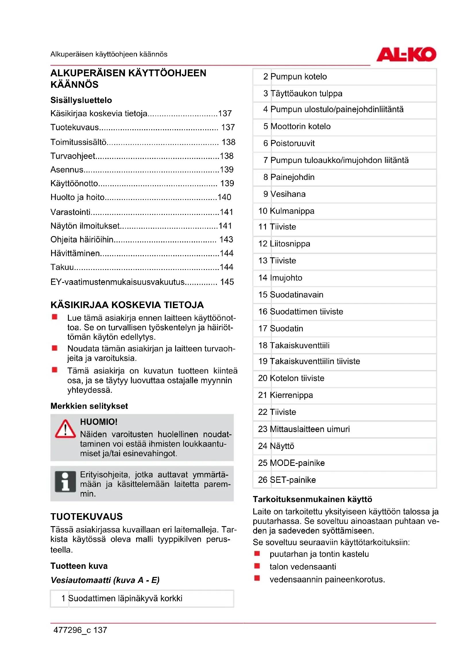Lue tämä asiakirja ennen laitteen käyttöönot- toa. Se on turvallisen työskentelyn ja häiriöt- tömän käytön edellytys. Noudata tämän asiakirjan ja laitteen turvaoh- jeita ja varoituksia. Tämä asiakirja on kuvatun tuotteen kiinteä osa, ja se täytyy luovuttaa ostajalle myynnin yhteydessä. Merkkien selitykset HUOMIO! Näiden varoitusten huolellinen noudat- taminen voi estää ihmisten loukkaantu- miset ja/tai esinevahingot. ADVICE Erityisohjeita, jotka auttavat ymmärtä- mään ja käsittelemään laitetta parem- min. TUOTEKUVAUS Tässä asiakirjassa kuvaillaan eri laitemalleja. Tar- kista käytössä oleva malli tyyppikilven perus- teella. Tuotteen kuva Vesiautomaatti (kuva A - E) 1 Suodattimen läpinäkyvä korkki 2 Pumpun kotelo 3 Täyttöaukon tulppa 4 Pumpun ulostulo/painejohdinliitäntä 5 Moottorin kotelo 6 Poistoruuvit 7 Pumpun tuloaukko/imujohdon liitäntä 8 Painejohdin 9 Vesihana 10 Kulmanippa 11 Tiiviste 12 Liitosnippa 13 Tiiviste 14 Imujohto 15 Suodatinavain 16 Suodattimen tiiviste 17 Suodatin 18 Takaiskuventtiili 19 Takaiskuventtiilin tiiviste 20 Kotelon tiiviste 21 Kierrenippa 22 Tiiviste 23 Mittauslaitteen uimuri 24 Näyttö 25 MODE-painike 26 SET-painike Tarkoituksenmukainen käyttö Laite on tarkoitettu yksityiseen käyttöön talossa ja puutarhassa. Se soveltuu ainoastaan puhtaan ve- den ja sadeveden syöttämiseen. Se soveltuu seuraaviin käyttötarkoituksiin: puutarhan ja tontin kastelu talon vedensaanti vedensaannin paineenkorotus.fi Tuotekuvaus
