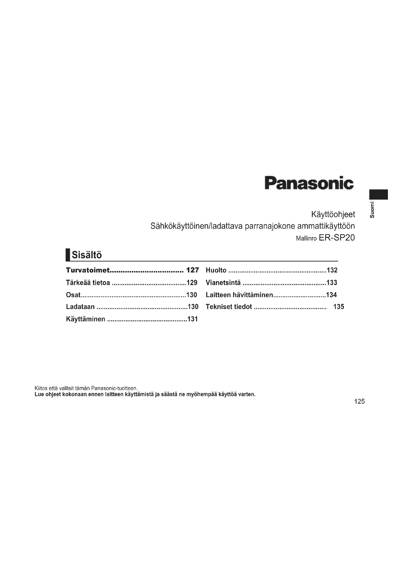 - Ympäristönsuojelujamateriaalienkierrätys Tässä laitteessa on litiumioniakku. Varmista, että akku hävitetään ongelmajätekeskuksen kautta, mikäli maassasi on sellainen.135 Suomi Tekniset tiedot Virtalähde Katso verkkolaitteen arvokilvestä. (automaattinen jännitteenvalinta) Moottorin jännite 3,6 V Latausaika Noin 1 tunti Lisätietoa tuotteen energiatehokkuudesta saat nettisivuiltamme, osoitteessa, www.panasonic.com, syöttämällä hakukuvaan mallinumeron. Vanhojen laitteiden ja paristojen hävittäminen VainEU-jäsenmaillejakierrätysjärjestelmääkäyttävillemaille Tämä symboli tuotteissa, pakkauksessa ja/tai asiakirjoissa tarkoittaa, että käytettyjä sähköllä toimivia ja elektronisia tuotteita eikä paristoja ei saa laittaa yleisiin talousjätteisiin. Johda vanhat tuotteet ja käytetyt paristot käsittelyä, uusiointia tai kierrätystä varten vastaaviin keräyspisteisiin laissa annettujen määräysten mukaisesti. Hävittämällä tuotteet asiaankuuluvasti, autat samalla suojaamaan arvokkaita luonnonvaroja ja estämään mahdollisia negatiivisia vaikutuksia ihmiseen ja luontoon. Lisätietoa keräämisestä ja kierrätyksestä saa paikalliselta jätehuollosta vastuulliselta viranomaiselta. Maiden lainsäädännön mukaisesti tämän jätteen määräystenvastaisesta hävittämisestä voidaan antaa sakkorangaistuksia. Huomautusparistosymbolista(symbolialhaalla) Tämä symboli voidaan näyttää jonkin kemiallisen symbolin yhteydessä. Siinä tapauksessa se perustuu vastaaviin direktiiveihin, jotka on annettu kyseessä olevalle kemikaalille. Maahantuoja: Panasonic Marketing Europe GmbH Valtuutettu edustaja EU:ssa: Panasonic Testing Centre Winsbergring 15, 22525 Hampuri, Saksa Valmistaja: Panasonic Corporation 1006, Oaza Kadoma, Kadoma‑kaupunki, Osaka, Japani136137 Polski Instrukcja obsługi Profesjonalna akumulatorowa golarka elektryczna Nr modelu ER‑SP20 Dziękujemy za wybór produktu rmy Panasonic. Przedrozpoczęciemużytkowaniategourządzeniaprosimyoprzeczytaniecałejinstrukcjiizachowaniejejdowykorzystaniawprzyszłości. Środki ostrożności p. 139