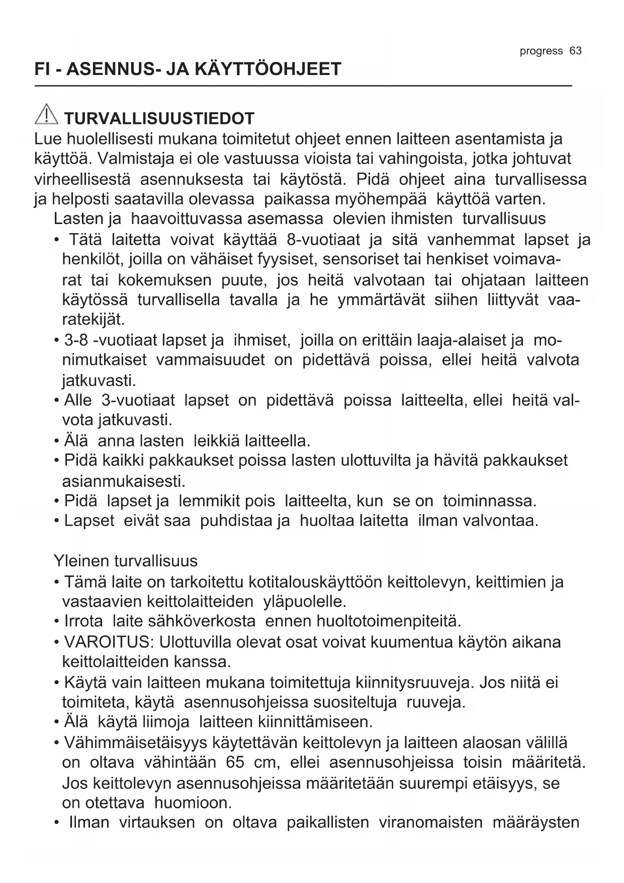 - Älä asenna poistoilmaa seinän onteloon,progress 65 ellei onteloa ole suunniteltu tähän tarkoi- tukseen. Tarkista sähköliitännät VAROITUS! Tulipalon ja sähköiskun vaara.