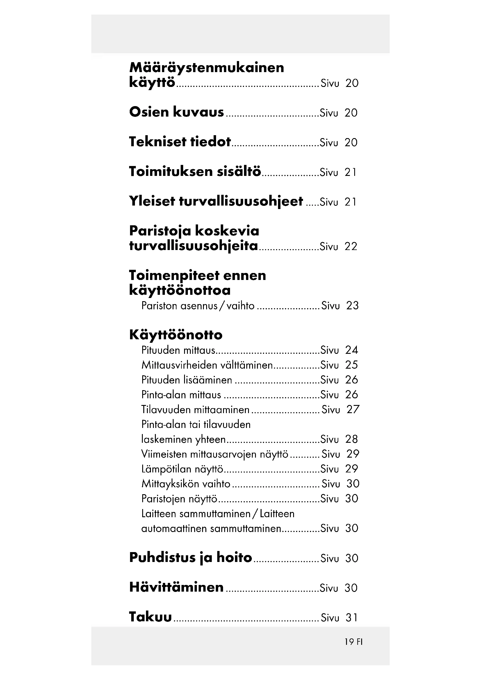Paristolokeron kansi Tekniset tiedot Käyttöjännite: kork. 9 V Paristomalli: 6LR61 (9 V–sarja) Mittausalue: 0,6 m – 16 m Mittaustarkkuus: +/- 1% Näytön kapasiteetti: enintään 9999,99 Laserin aallonpituus: 635–660 nm, 1 mW Laser-luokka: 221 FI Ultraäänen taajuus: 40 kHz Mittausalue lämpömittari: –10 °C – +40 °C (14 °F – 104 °F) Toimituksen sisältö 1 Ultraäänietäisyysmittari 1 9 V-sarjaparisto 1 Käyttöohje Yleiset turvallisuusohjeet Tutustu ennen tuotteen käyttöä huolellisesti kaikkiin käyttö- ja turvallisuusohjeisiin! Anna kaikki ohjeet tuotteen mukana mahdolliselle uudelle omistajalle! Tarkista tuote ennen käyttöönottoa vaurioiden varalta! Älä koskaan ota vaurioitunutta tuotetta käyttöön! Älä altista tuotetta kosteudelle! Tämä voi vaurioittaa sitä. Laitetta voivat käyttää 8 vuotta täyttäneet lap- set ja henkilöt, jotka ovat fyysisiltä tai psyykki- siltä kyvyiltääntai aisteiltaan rajoittuneita tai joilla ei ole kokemusta tai tietoa laitteen käytöstä, jos he käyttävät laitettavalvonnan alaisina tai heitä on opastettu laitteen turval- lisessa käytössä ja he ovat tietoisia laittee- seen liittyvistä vaaroista. Lapset eivät saa leikkiä laitteella. Lapset eivät saa puhdistaa tai huoltaa laitetta ilman valvontaa.22 FI Lasersäteilyn aiheuttama vaara LASERSÄTEILY