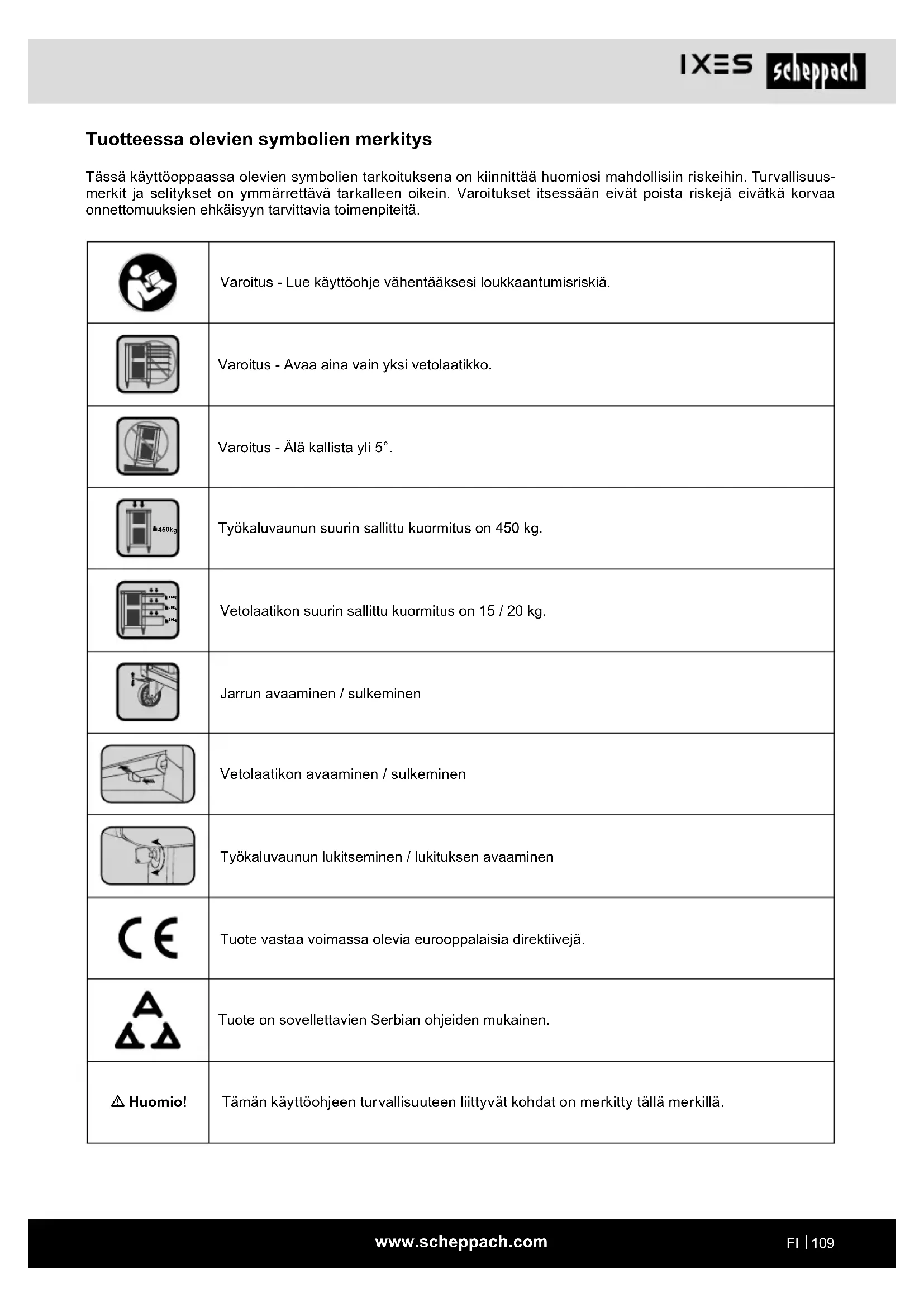 Tuotteessa olevien symbolien merkitys Tässä käyttöoppaassa olevien symbolien tarkoituksena on kiinnittää huomiosi mahdollisiin riskeihin. Turvallisuus- merkit ja selitykset on ymmärrettävä tarkalleen oikein. Varoitukset itsessään eivät poista riskejä eivätkä korvaa onnettomuuksien ehkäisyyn tarvittavia toimenpiteitä. Varoitus - Lue käyttöohje vähentääksesi loukkaantumisriskiä. Varoitus - Avaa aina vain yksi vetolaatikko. Varoitus - Älä kallista yli 5°. 450kg Työkaluvaunun suurin sallittu kuormitus on 450 kg. 15kg 20kg 20kg Vetolaatikon suurin sallittu kuormitus on 15 / 20 kg. Jarrun avaaminen / sulkeminen Vetolaatikon avaaminen / sulkeminen Työkaluvaunun lukitseminen / lukituksen avaaminen Tuote vastaa voimassa olevia eurooppalaisia direktiivejä. Tuote on sovellettavien Serbian ohjeiden mukainen. m Huomio! Tämän käyttöohjeen turvallisuuteen liittyvät kohdat on merkitty tällä merkillä.www.scheppach.com