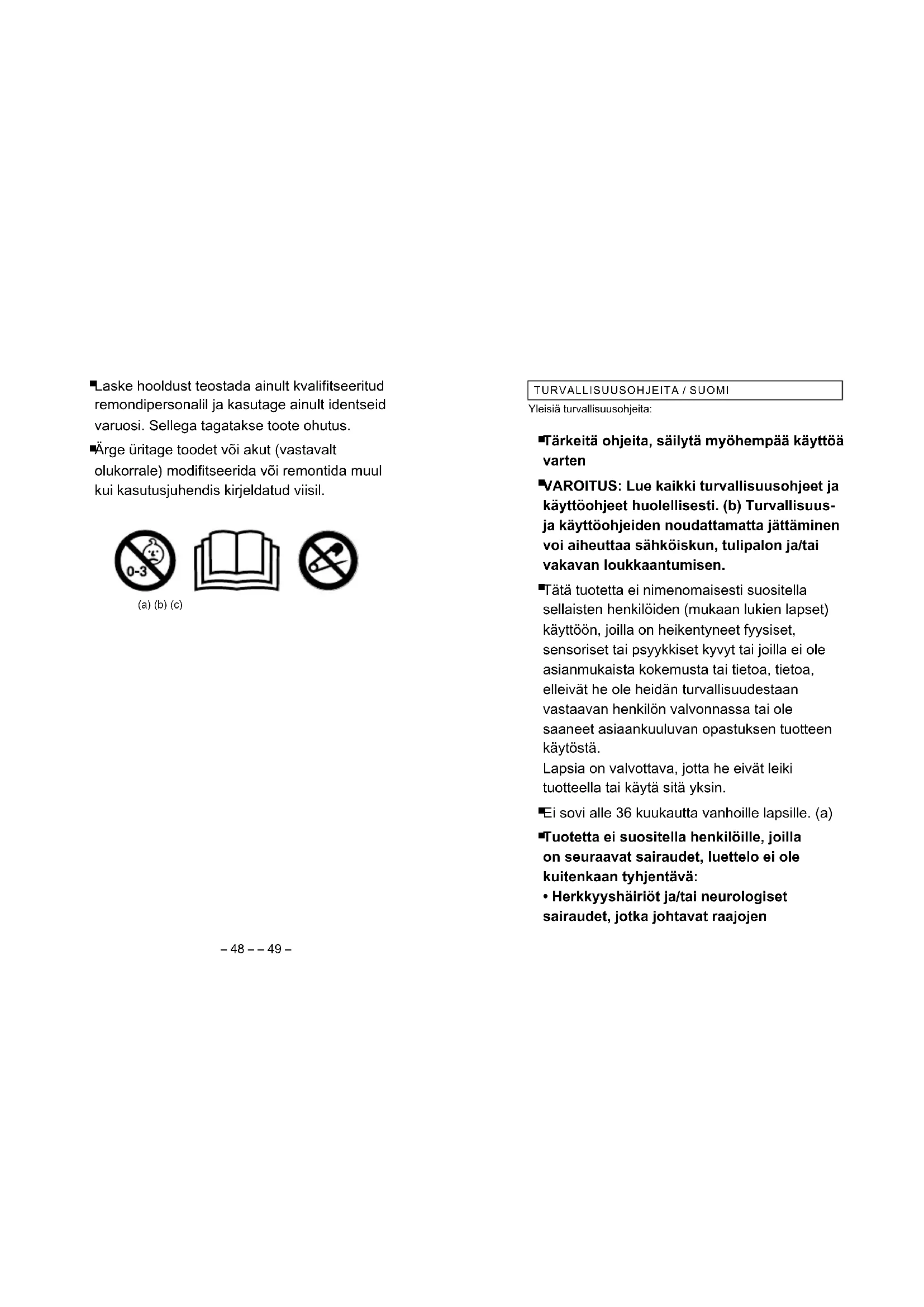 Ärge üritage toodet või akut (vastavalt olukorrale) moditseerida või remontida muul kui kasutusjuhendis kirjeldatud viisil. (a) (b) (c)– 50 – – 51 – tai pysyvästi lääkkeitä ja/tai et pysty kunnolla aistimaan lämpöä tai kylmyyttä (esim. vammaiset henkilöt jne.), keskustele lääkärisi kanssa ennen tuotteen käyttöä!