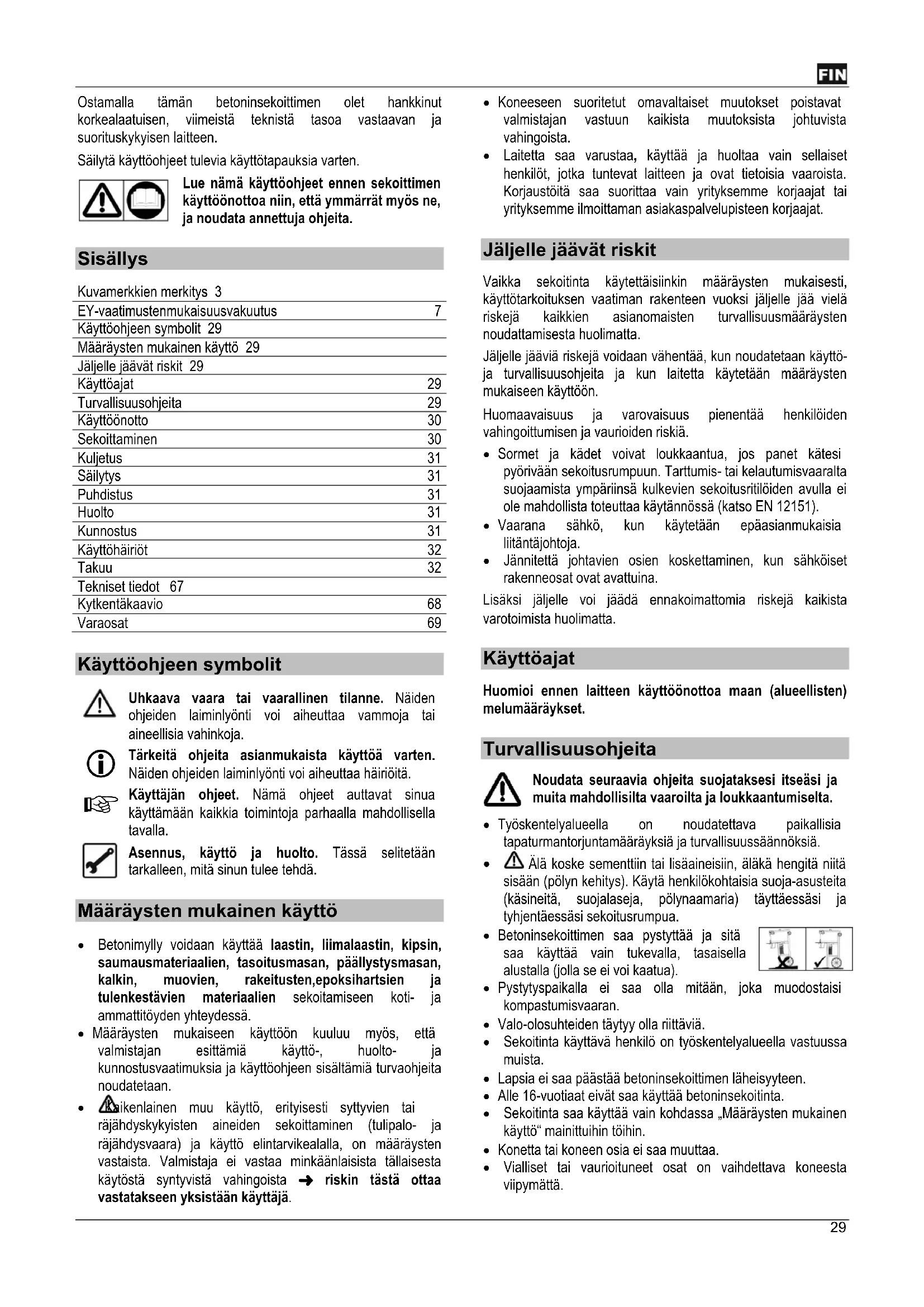 Sisällys Kuvamerkkien merkitys 3 EY-vaatimustenmukaisuusvakuutus 7 Käyttöohjeen symbolit 29 Määräysten mukainen käyttö 29 Jäljelle jäävät riskit 29 Käyttöajat 29 Turvallisuusohjeita 29 Käyttöönotto 30 Sekoittaminen 30 Kuljetus 31 Säilytys 31 Puhdistus 31 Huolto 31 Kunnostus 31 Käyttöhäiriöt 32 Takuu 32 Tekniset tiedot 67 Kytkentäkaavio 68 Varaosat 69