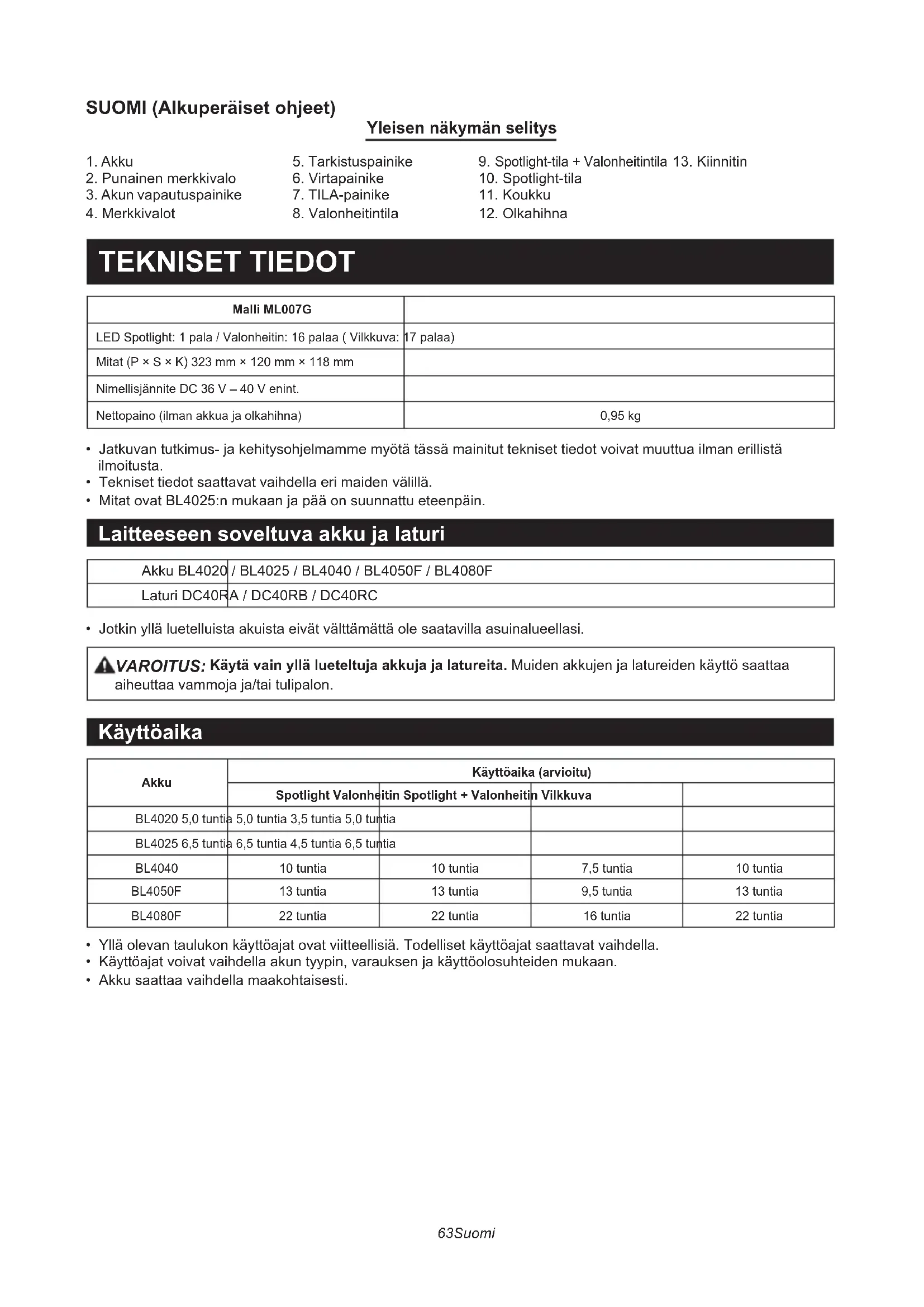 - Jotkin yllä luetelluista akuista eivät välttämättä ole saatavilla asuinalueellasi. VAROITUS: Käytä vain yllä lueteltuja akkuja ja latureita. Muiden akkujen ja latureiden käyttö saattaa aiheuttaa vammoja ja/tai tulipalon. Käyttöaika Akku Käyttöaika (arvioitu)Spotlight Valonheitin Spotlight + Valonheitin VilkkuvaBL4020 5,0 tuntia 5,0 tuntia 3,5 tuntia 5,0 tuntiaBL4025 6,5 tuntia 6,5 tuntia 4,5 tuntia 6,5 tuntia BL4040 10 tuntia 10 tuntia 7,5 tuntia 10 tuntia BL4050F 13 tuntia 13 tuntia 9,5 tuntia 13 tuntia BL4080F 22 tuntia 22 tuntia 16 tuntia 22 tuntia