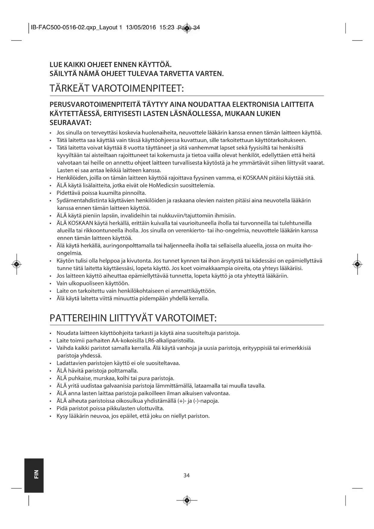 - Kysy lääkärin neuvoa, jos epäilet, että joku on niellyt pariston. IB-FAC500-0516-02.qxp_Layout 1 13/05/2016 15:23 Page 3435 FIN PARISTOJEN ASENTAMINEN