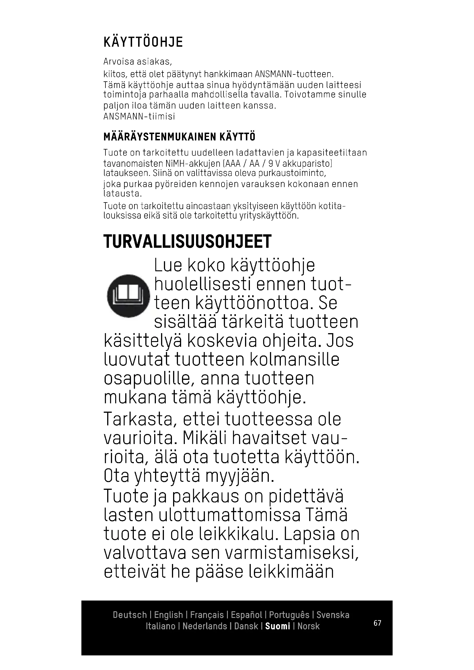 Arvoisa asiakas, kiitos, että olet päätynyt hankkimaan ANSMANN-tuotteen. Tämä käyttöohje auttaa sinua hyödyntämään uuden laitteesi toimintoja parhaalla mahdollisella tavalla. Toivotamme sinulle paljon iloa tämän uuden laitteen kanssa. ANSMANN-tiimisi