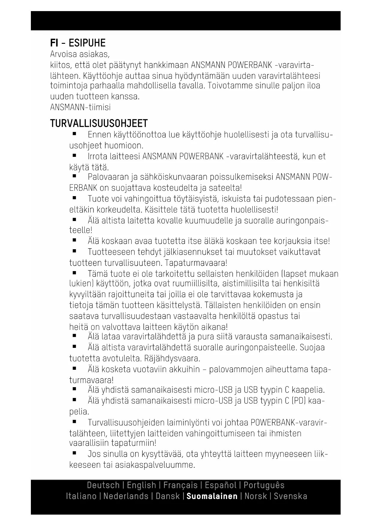 Arvoisa asiakas, kiitos, että olet päätynyt hankkimaan ANSMANN POWERBANK -varavirta- lähteen. Käyttöohje auttaa sinua hyödyntämään uuden varavirtalähteesi toimintoja parhaalla mahdollisella tavalla. Toivotamme sinulle paljon iloa uuden tuotteen kanssa. ANSMANN-tiimisi TURVALLISUUSOHJEET Ennen käyttöönottoa lue käyttöohje huolellisesti ja ota turvallisu- usohjeet huomioon. Irrota laitteesi ANSMANN POWERBANK -varavirtalähteestä, kun et käytä tätä. Palovaaran ja sähköiskunvaaran poissulkemiseksi ANSMANN POW- ERBANK on suojattava kosteudelta ja sateelta! Tuote voi vahingoittua töytäisyistä, iskuista tai pudotessaan pien- eltäkin korkeudelta. Käsittele tätä tuotetta huolellisesti! Älä altista laitetta kovalle kuumuudelle ja suoralle auringonpais- teelle! Älä koskaan avaa tuotetta itse äläkä koskaan tee korjauksia itse! Tuotteeseen tehdyt jälkiasennukset tai muutokset vaikuttavat tuotteen turvallisuuteen. Tapaturmavaara! Tämä tuote ei ole tarkoitettu sellaisten henkilöiden (lapset mukaan lukien) käyttöön, jotka ovat ruumiillisilta, aistimillisilta tai henkisiltä kyvyiltään rajoittuneita tai joilla ei ole tarvittavaa kokemusta ja tietoja tämän tuotteen käsittelystä. Tällaisten henkilöiden on ensin saatava turvallisuudestaan vastaavalta henkilöltä opastus tai heitä on valvottava laitteen käytön aikana! Älä lataa varavirtalähdettä ja pura siitä varausta samanaikaisesti. Älä altista varavirtalähdettä suoralle auringonpaisteelle. Suojaa tuotetta avotulelta. Räjähdysvaara. Älä kosketa vuotaviin akkuihin – palovammojen aiheuttama tapa- turmavaara! Älä yhdistä samanaikaisesti micro-USB ja USB tyypin C kaapelia. Älä yhdistä samanaikaisesti micro-USB ja USB tyypin C (PD) kaa- pelia. Turvallisuusohjeiden laiminlyönti voi johtaa POWERBANK-varavir- talähteen, liitettyjen laitteiden vahingoittumiseen tai ihmisten vaarallisiin tapaturmiin! Jos sinulla on kysyttävää, ota yhteyttä laitteen myyneeseen liik- keeseen tai asiakaspalveluumme.Deutsch | English | Français | Español | Português Italiano | Nederlands | Dansk | Suomalainen | Norsk | Svenska VARO RÄJÄHDYSVAARA, JOS AKKU KORVATAAN VIRHEELLISELLÄ TYYPILLÄ. HÄVITÄ KÄYTETYT AKUT OHJEIDEN MUKAISESTI.