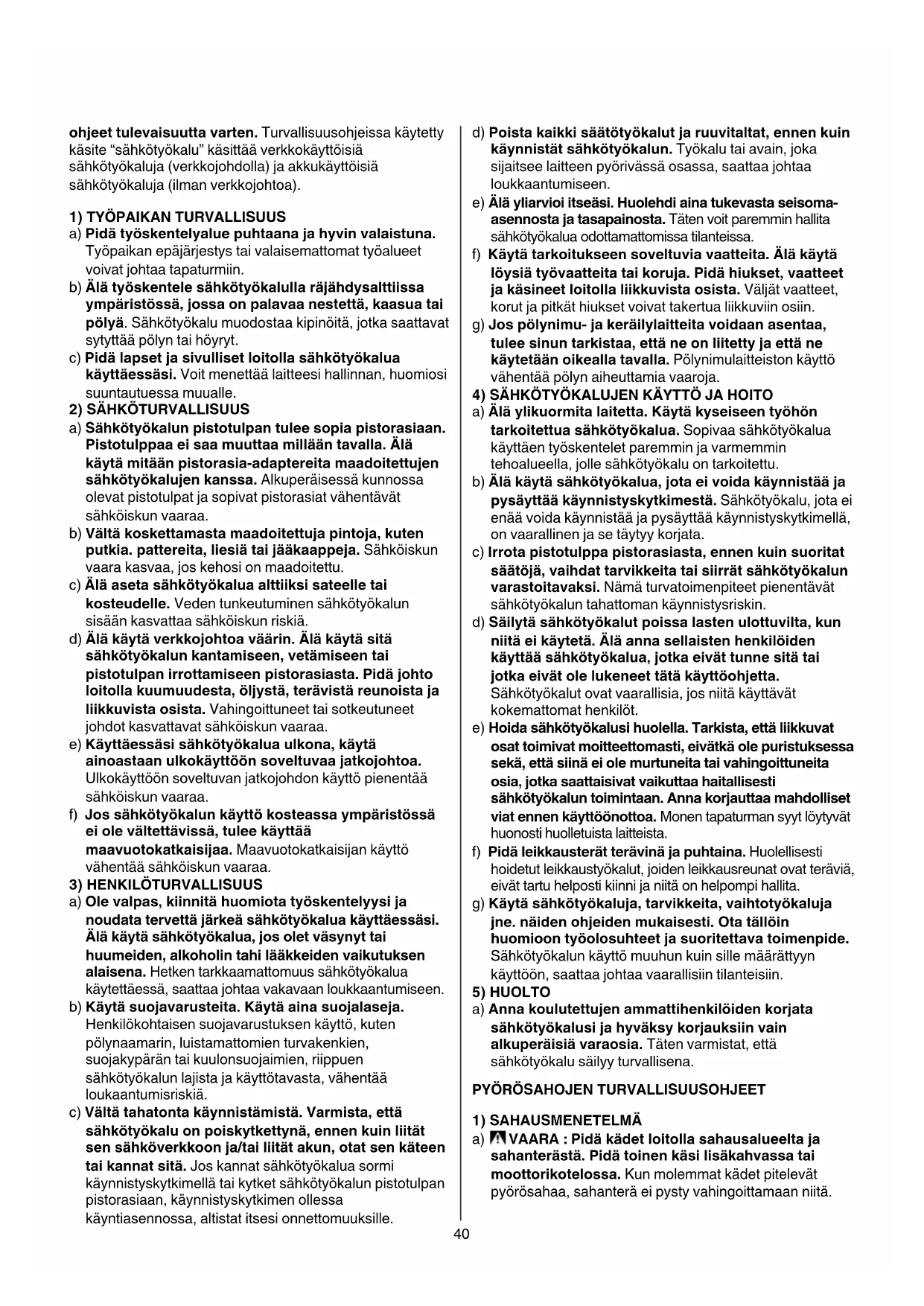 - Lue ja säilytä tämä ohjekirja 2 TEKNISET TIEDOT 1 TURVALLISUUS YLEISET TURVALLISUUSOHJEET HUOMIO! Lue kaikki turvallisuus- ja muut ohjeet. Turvallisuusohjeiden noudattamisen laiminlyönti saattaa johtaa sähköiskuun, tulipaloon ja/tai vakavaan loukkaantumiseen. Säilytä kaikki turvallisuus- ja muut40 ohjeet tulevaisuutta varten. Turvallisuusohjeissa käytetty käsite “sähkötyökalu” käsittää verkkokäyttöisiä sähkötyökaluja (verkkojohdolla) ja akkukäyttöisiä sähkötyökaluja (ilman verkkojohtoa).