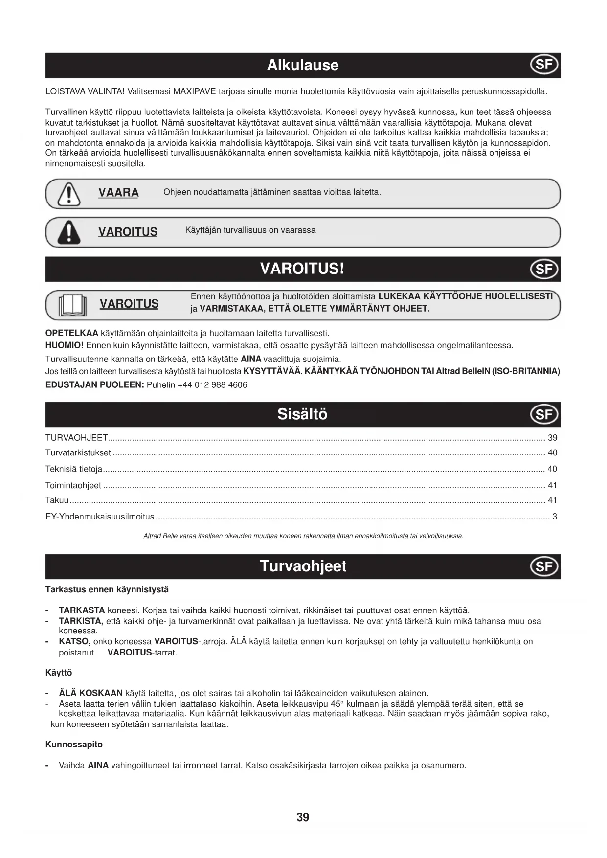 - LOISTAVA VALINTA! Valitsemasi MAXIPAVE tarjoaa sinulle monia huolettomia käyttövuosia vain ajoittaisella peruskunnossapidolla. Turvallinen käyttö riippuu luotettavista laitteista ja oikeista käyttötavoista. Koneesi pysyy hyvässä kunnossa, kun teet tässä ohjeessa kuvatut tarkistukset ja huollot. Nämä suositeltavat käyttötavat auttavat sinua välttämään vaarallisia käyttötapoja. Mukana olevat turvaohjeet auttavat sinua välttämään loukkaantumiset ja laitevauriot. Ohjeiden ei ole tarkoitus kattaa kaikkia mahdollisia tapauksia; on mahdotonta ennakoida ja arvioida kaikkia mahdollisia käyttötapoja. Siksi vain sinä voit taata turvallisen käytön ja kunnossapidon. On tärkeää arvioida huolellisesti turvallisuusnäkökannalta ennen soveltamista kaikkia niitä käyttötapoja, joita näissä ohjeissa ei nimenomaisesti suositella. TURVAOHJEET p. 39